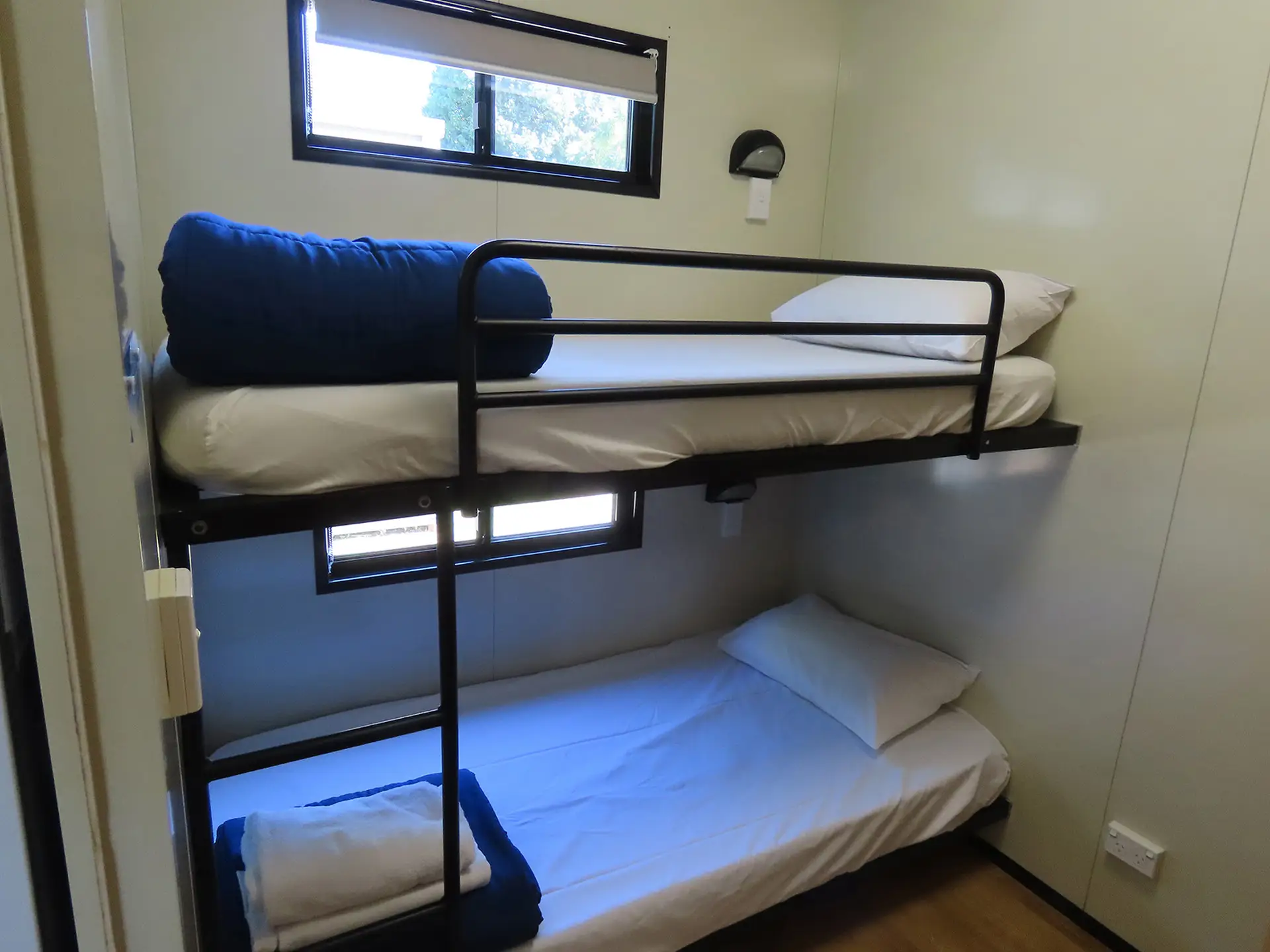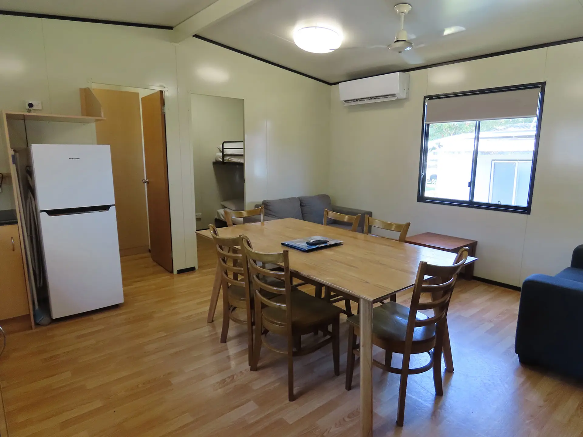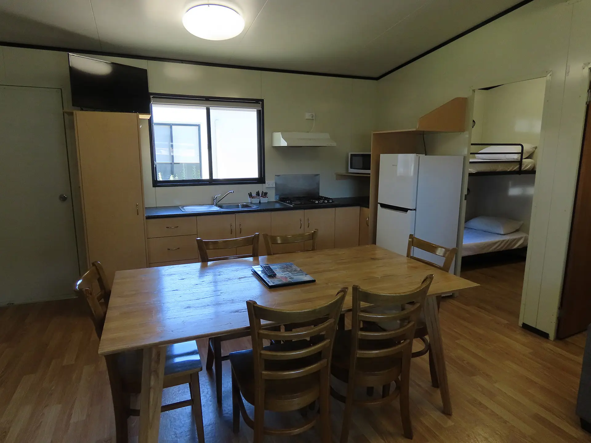 This fully self-contained cabin has 3 bedrooms with a queen bed in the main bedroom and two sets of bunks in the remaining two bedrooms. The separate living area has a fully self-contained kitchen, cooking facilities, digital television and split system/reverse cycle air conditioner. These cabins also have an outdoor setting to enjoy your morning coffee out in the fresh air.