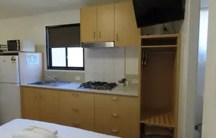 This fully self-contained modern open plan style cabin is simple but has all the necessities. Featuring a queen bed, set of bunks, ensuite, cooking facilities and split system/reverse cycle air conditioning for you to enjoy. Our cottage 4 berth cabins are close to all of the park facilities, BBQs, laundry and pool.