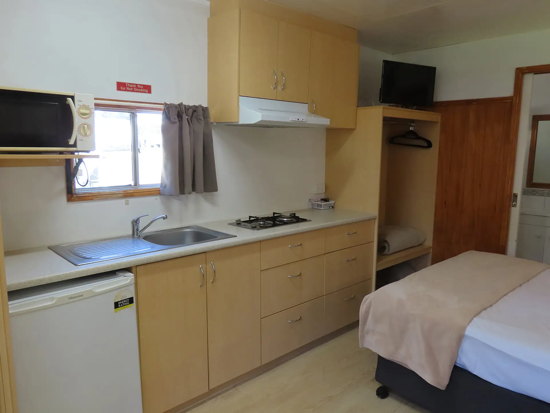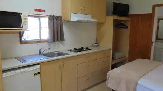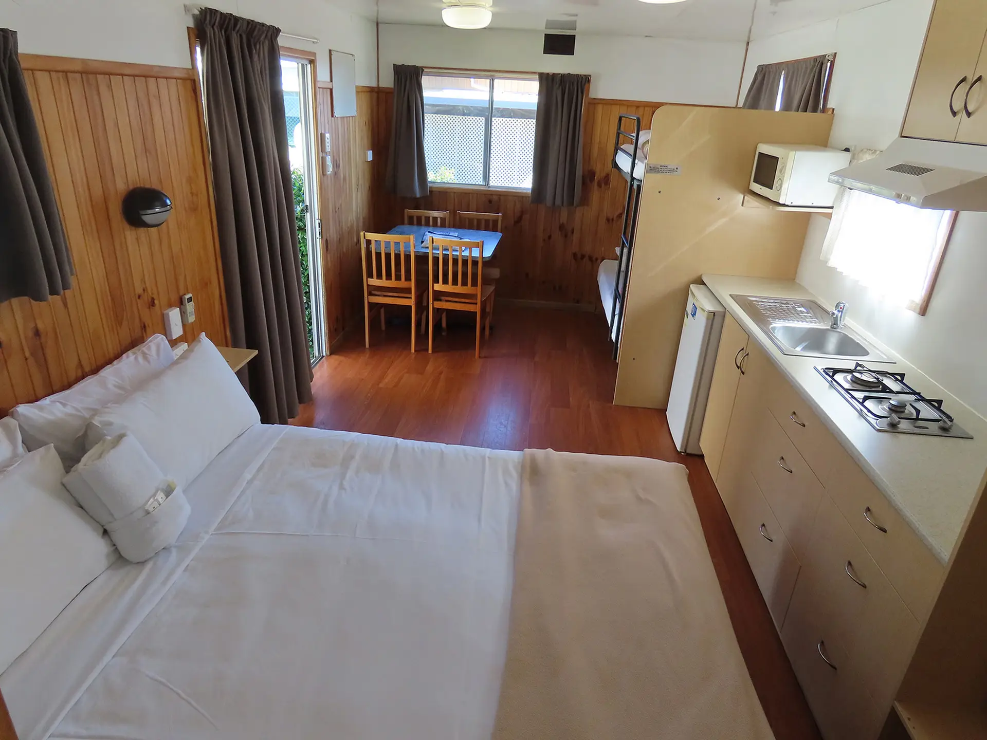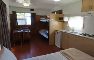 This fully self-contained lovingly restored open-plan style cabin has a double bed, set of bunks, ensuite, cooking facilities, and split system/reverse cycle air conditioning and digital television for you to enjoy. This is the perfect choice for the budget-conscious traveller. | Cabins of this type are also available as pet-friendly accommodation. An extra $15.00 per night per pet charge is to be paid on check-in when booking online. Maximum of 2 Pets.