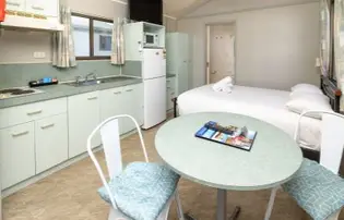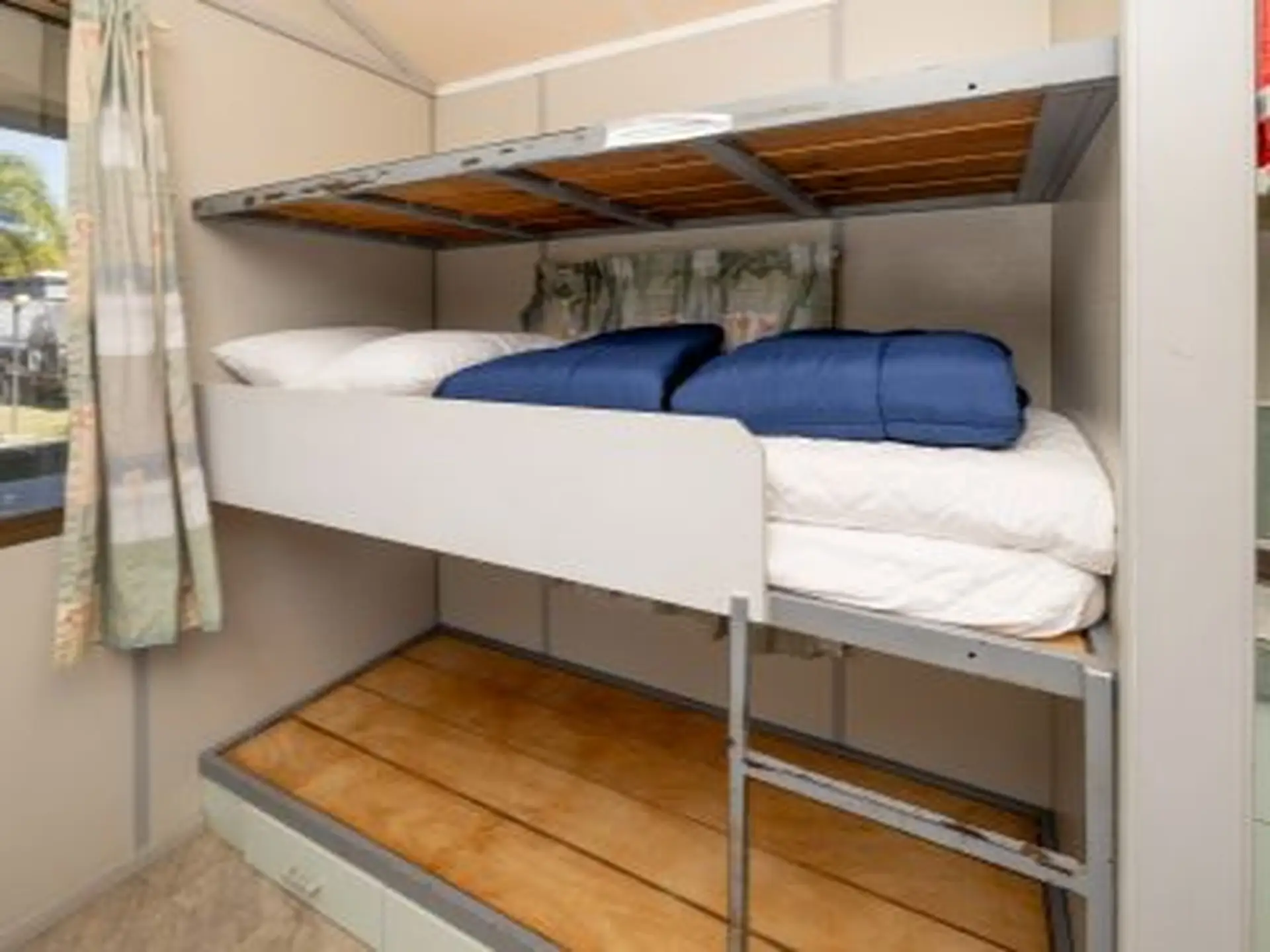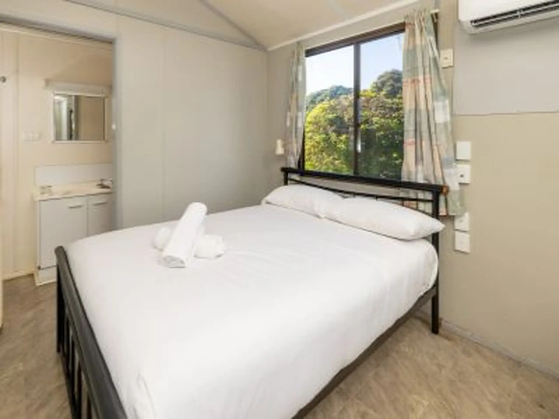 This compact studio sleeps up to four with a double bed and bunk set in an open-plan layout. Includes air conditioning, kitchenette with fridge, microwave and portable double cooktop, and private bathroom. A practical pick for budget-conscious guests wanting comfort and access to park facilities.