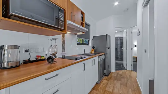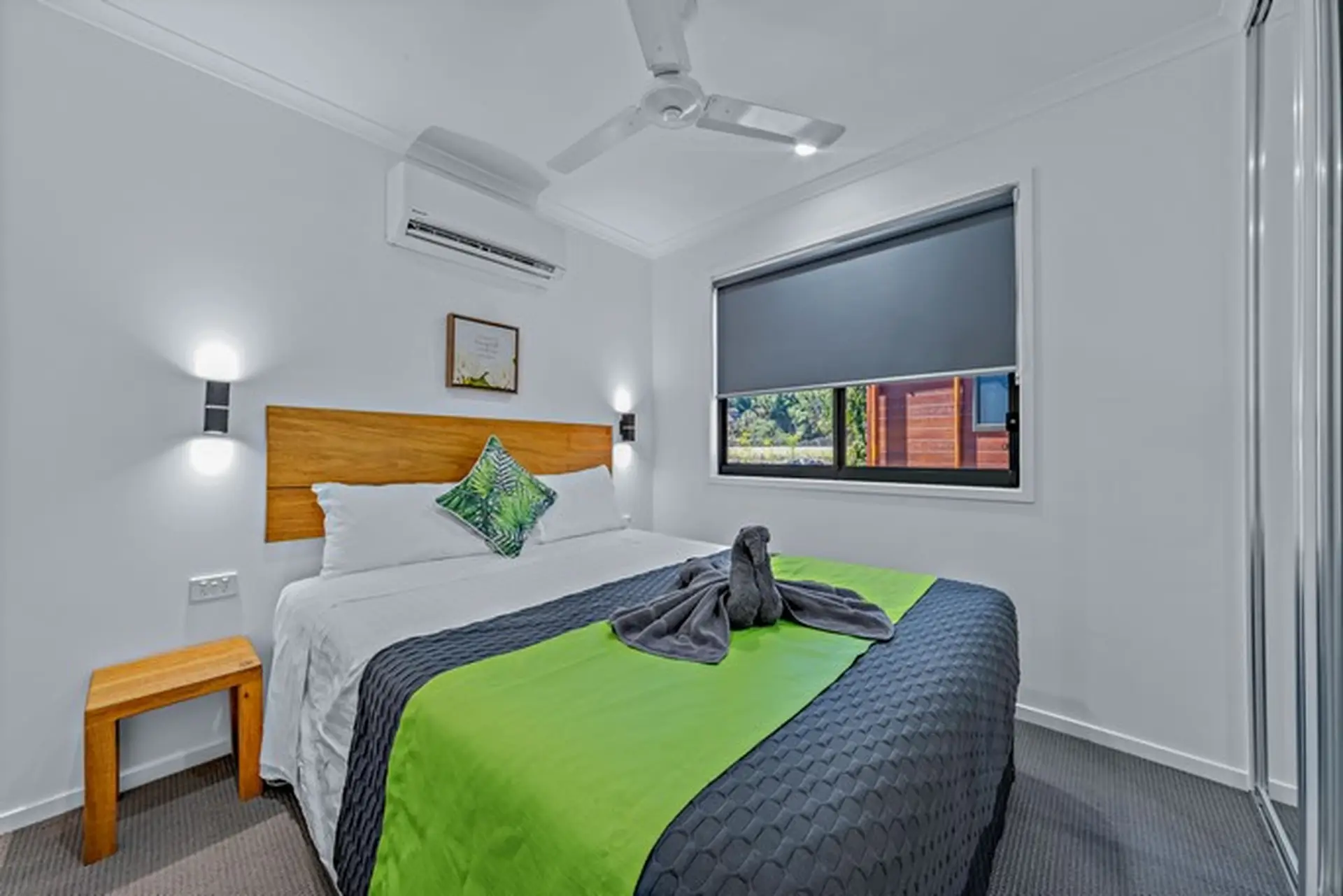 Enjoy a peaceful getaway in this two-bedroom cabin, ideal for up to six guests. The layout includes one queen bed and two sets of bunks, making it a great choice for families. The fully equipped kitchen features a stovetop, microwave, dishwasher, and large fridge. With air-conditioning and a spacious deck, it’s easy to relax after exploring the Whitsundays.