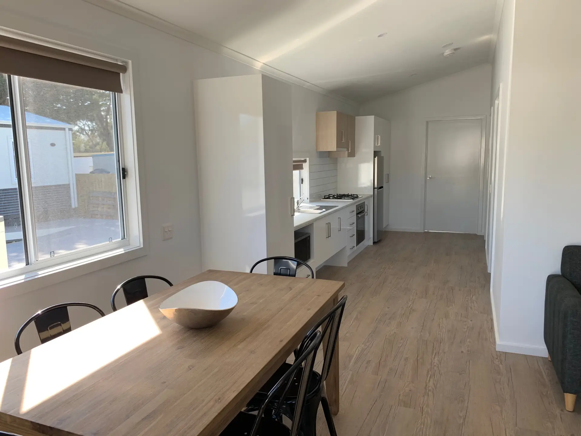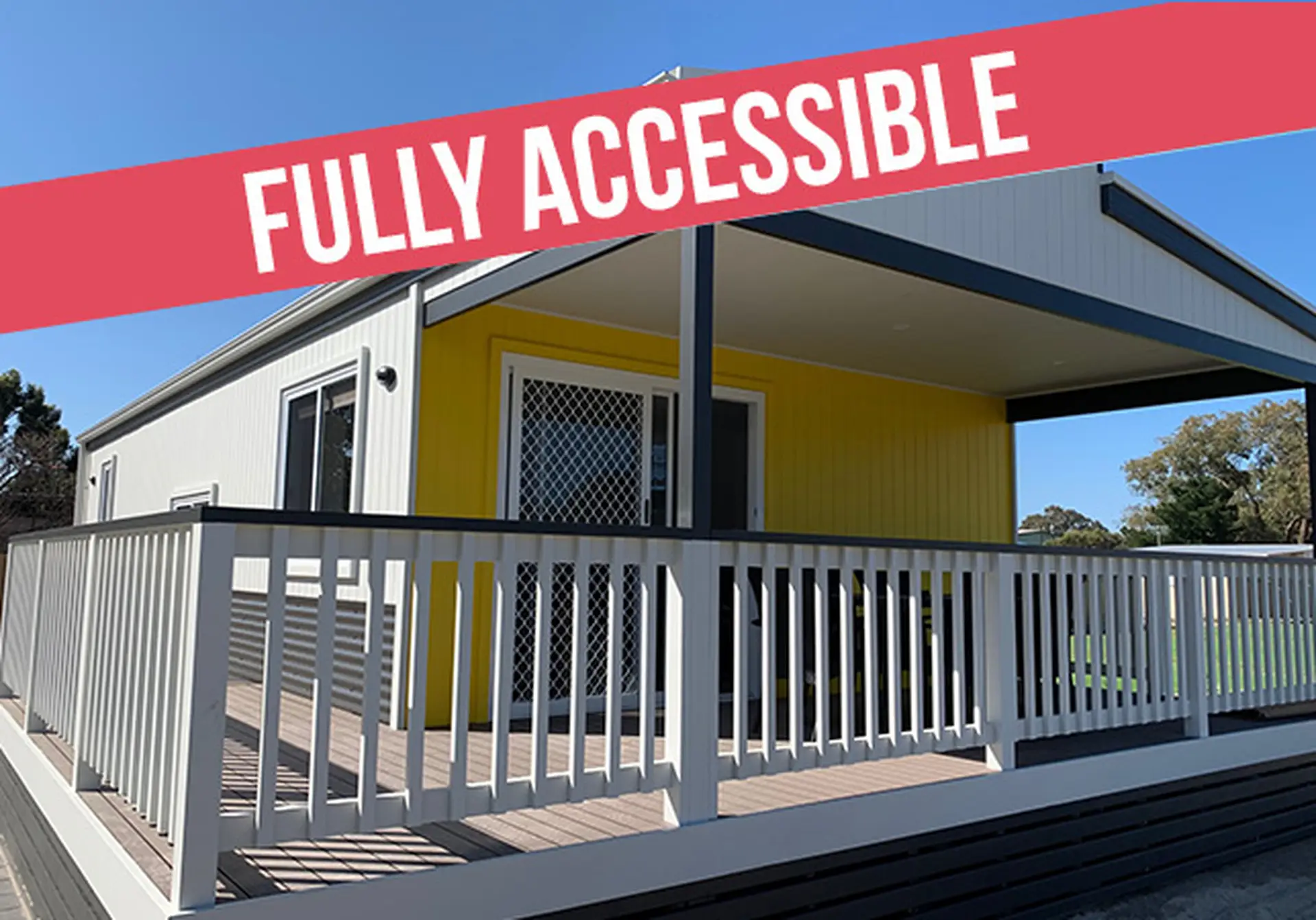 Thoughtfully designed for accessibility, this modern two-bedroom cabin sleeps up to five. The main bedroom has a queen bed, while the second offers a single bed and a set of single bunks. It includes a roll-in shower, grab rails, and spacious layout for ease of movement. The fully equipped kitchen features a gas oven, cooktop, microwave, and fridge. Air conditioning, a TV, and undercover deck overlooking the waterslide make it a comfortable and inclusive coastal retreat.