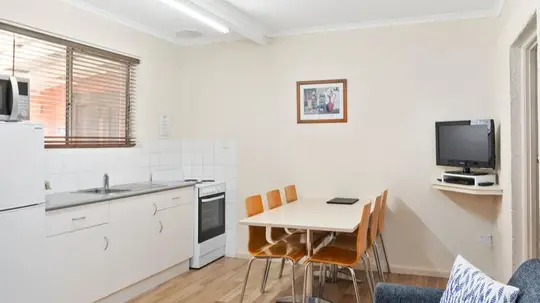 This two-bedroom motel unit is a comfortable choice for families or small groups, sleeping up to four with two double beds. It includes a private bathroom, air conditioning, and a kitchenette with electric cooktop, full electric oven, microwave, full-size fridge, toaster, and kettle. The open-plan living area offers a dining table and TV, while the patio provides a relaxing outdoor space. Ideal for short stays or easy coastal getaways.