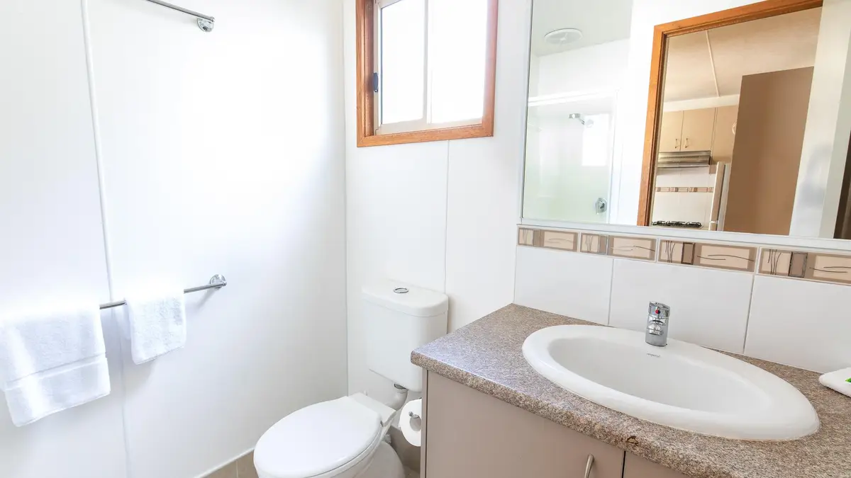 This two-bedroom cabin sleeps up to six guests with a queen bed in the main bedroom and two single bunks in the second. The open-plan layout includes a full kitchen with gas oven, stovetop, microwave, and full-size fridge, plus a dining space, lounge, TV, and year-round comfort with heating and cooling. Step out onto the private balcony with outdoor dining, just a short stroll from the BBQ area and pool.