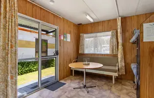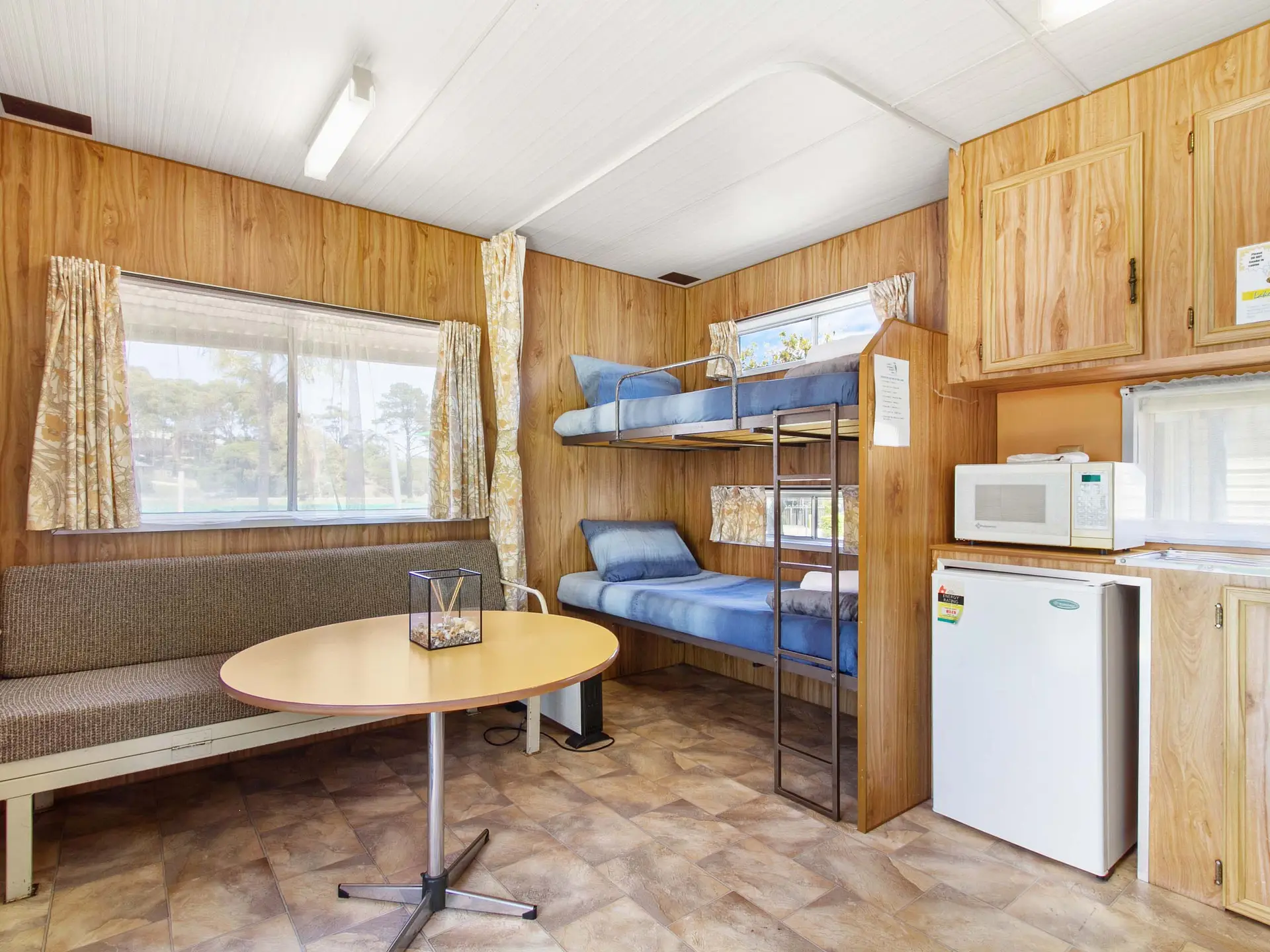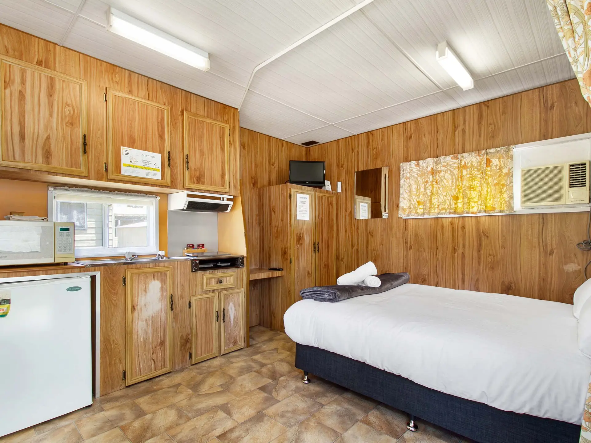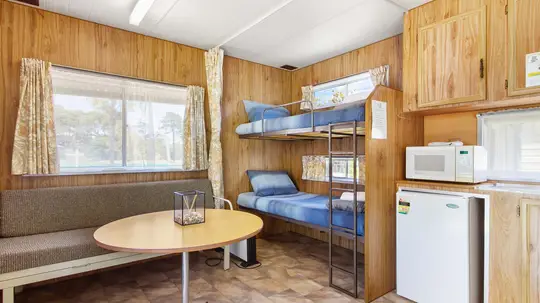 This budget-friendly cabin offers a cosy stay for up to four guests with one double bed and a set of single bunks in a compact open layout. It includes a basic kitchen with stovetop and bar fridge, plus TV and air conditioning. Please note, bathroom facilities are not included—guests have access to the park's communal amenities.