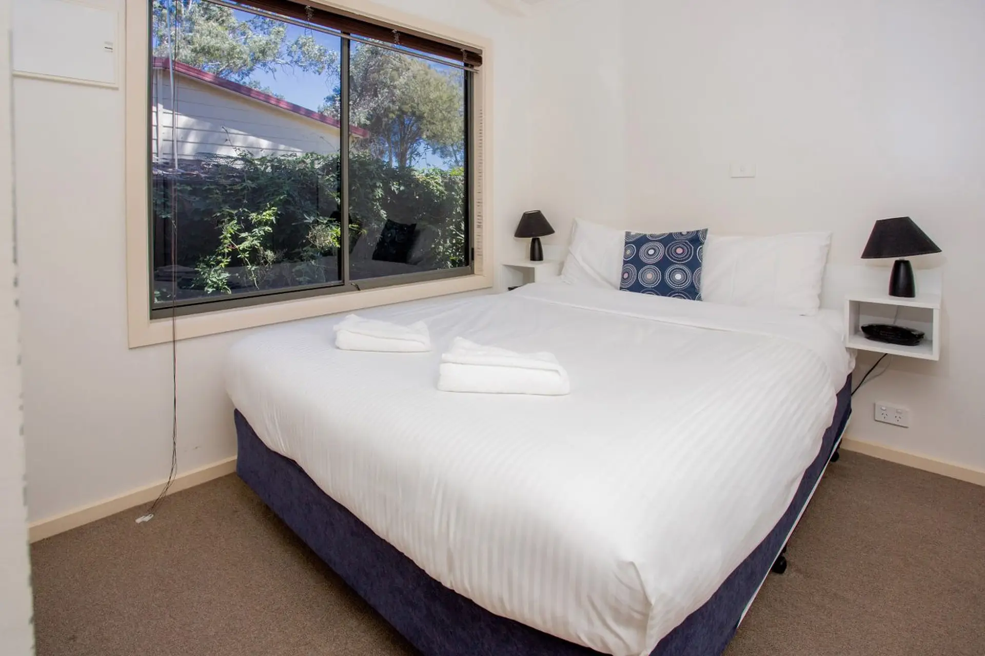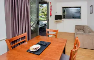 This well-appointed two-bedroom cabin sleeps up to four with a queen bed and a set of single bunk beds. It includes reverse cycle air conditioning, a TV, and a kitchenette with microwave, cooktop, and full-size fridge. Ideal for a comfortable and easy getaway.