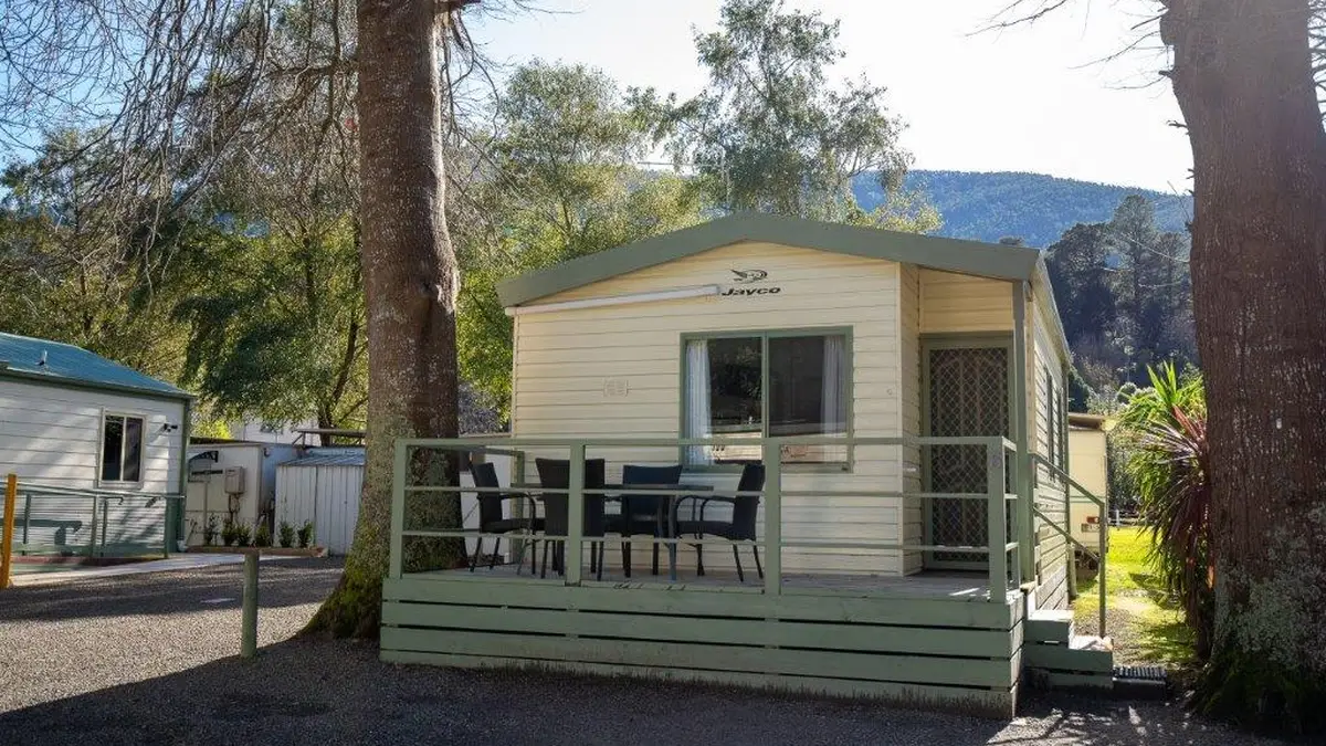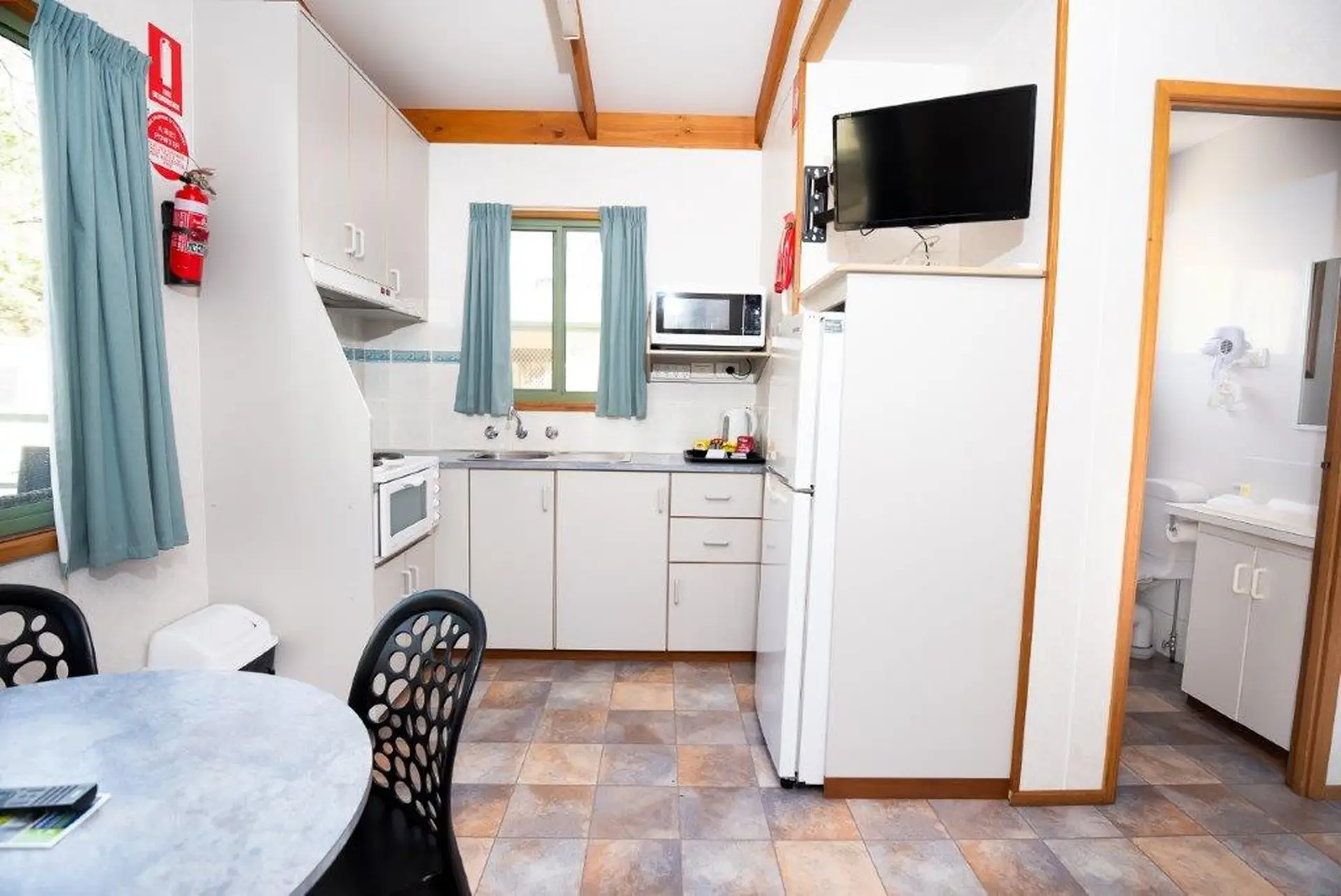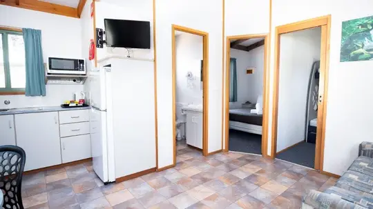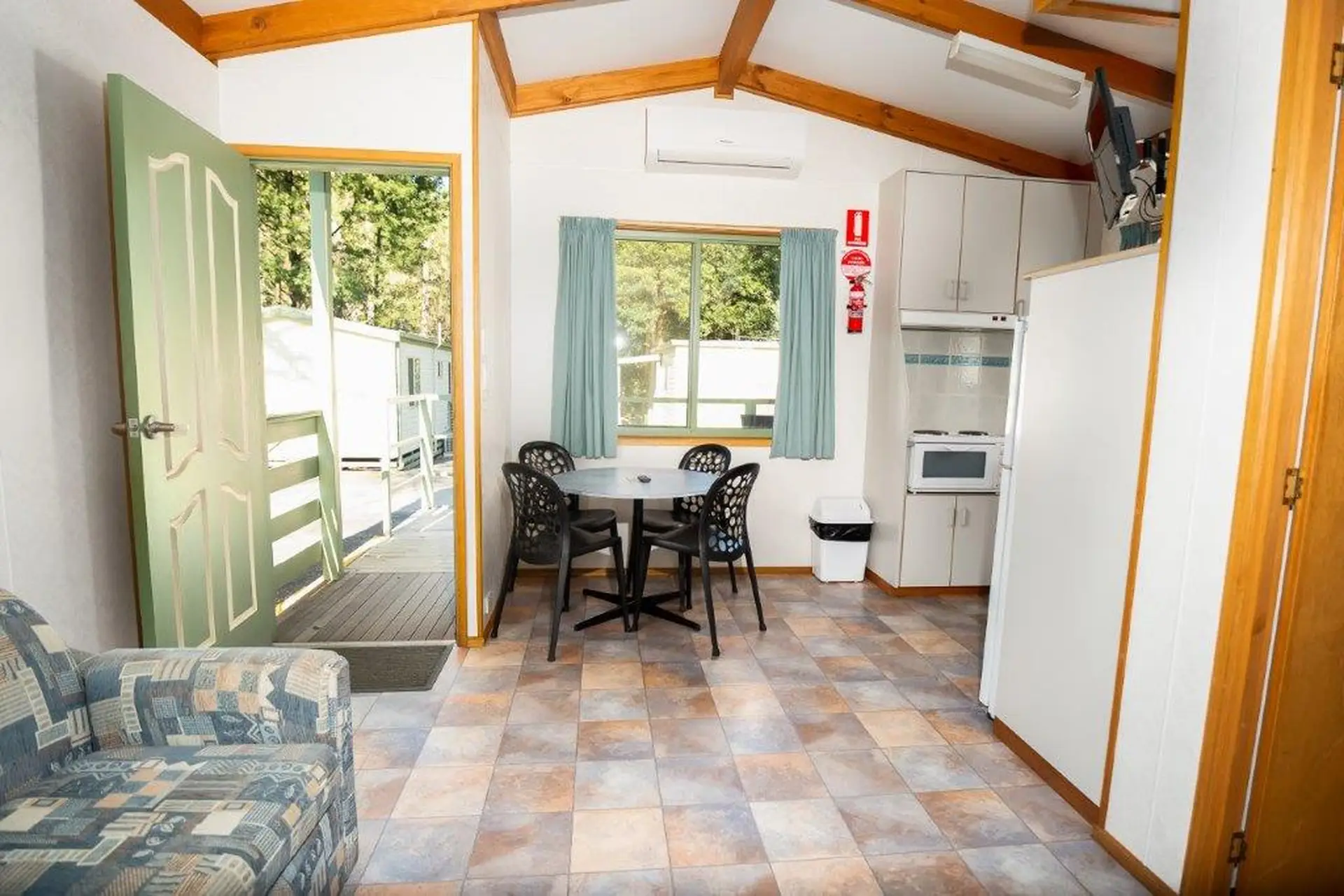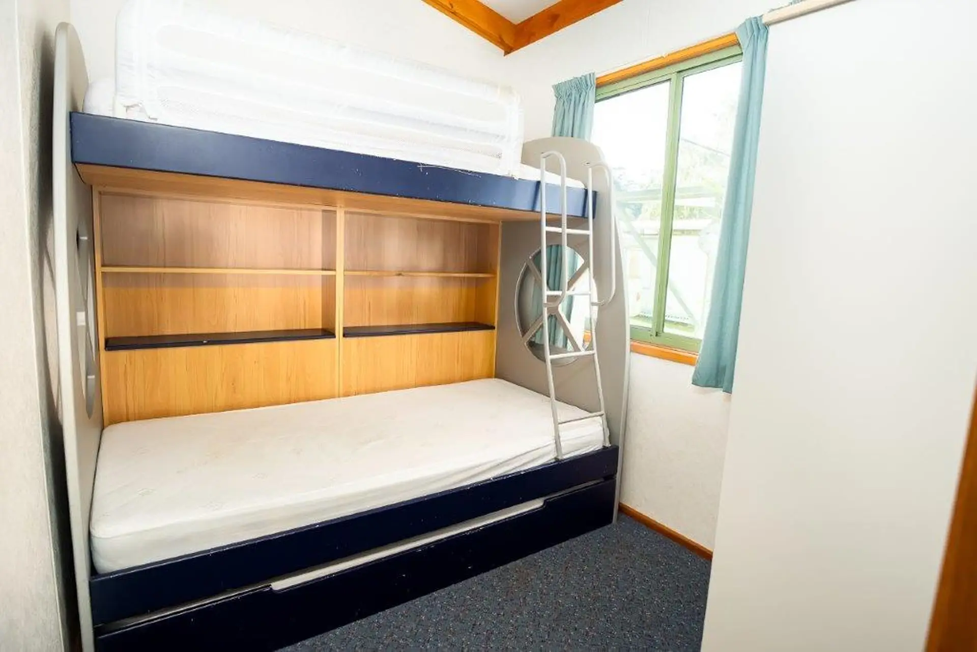 Ideal for families or small groups, this two-bedroom villa sleeps up to 4 guests with a double bed in one room and a single bunk in the other. The open-plan living area includes a sofa, dining table, TV, and air-conditioning for year-round comfort. A fully equipped kitchen features an electric stovetop, electric oven, microwave, and full-size fridge—great for easy, self-contained stays. The villa also includes a private bathroom and a decked outdoor area, perfect for relaxing after a day out. All linen is provided for your convenience.