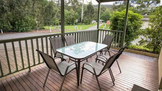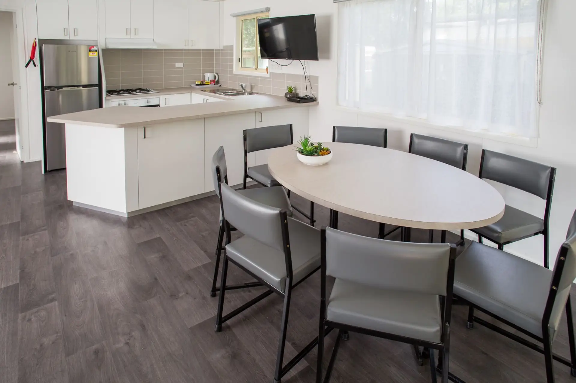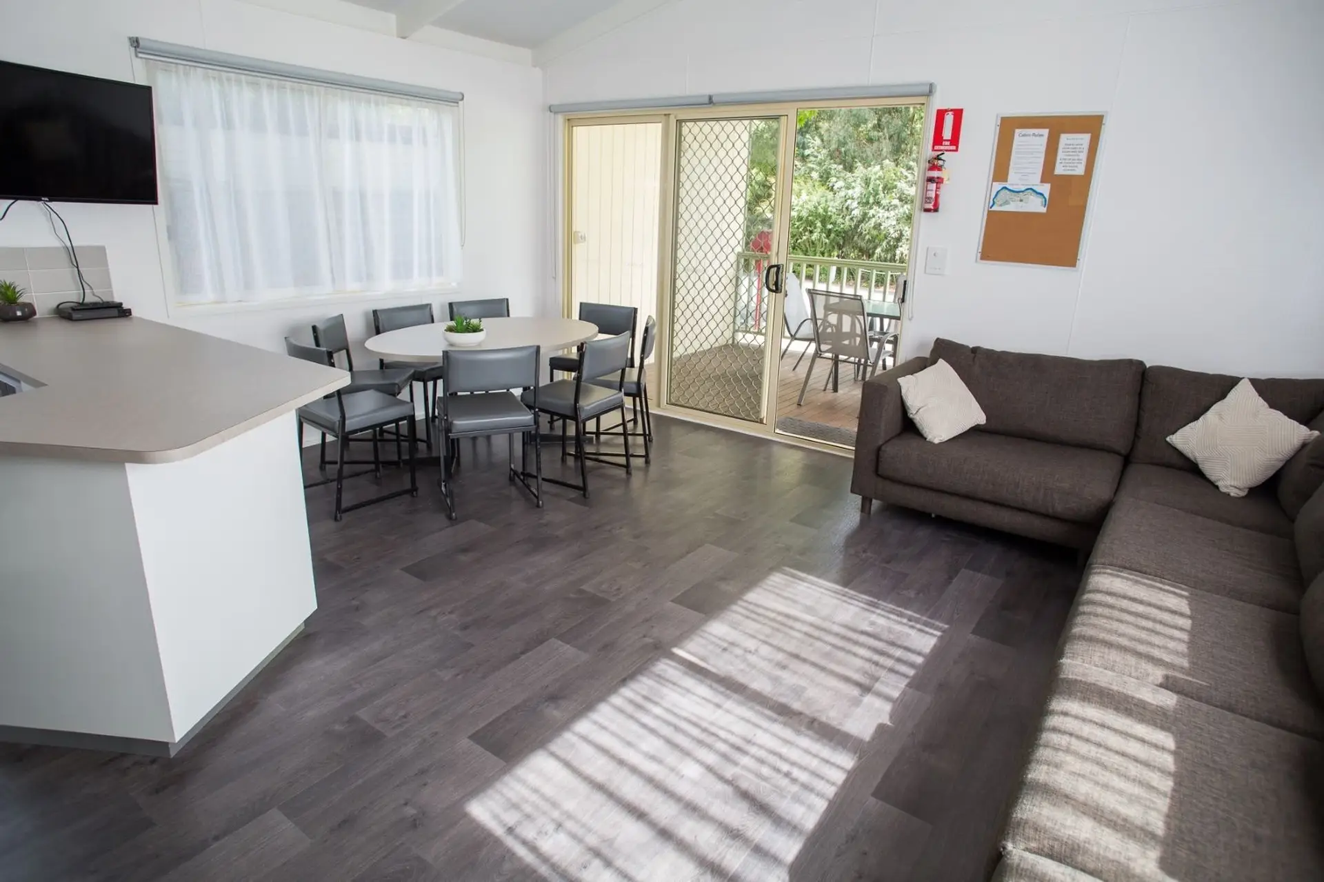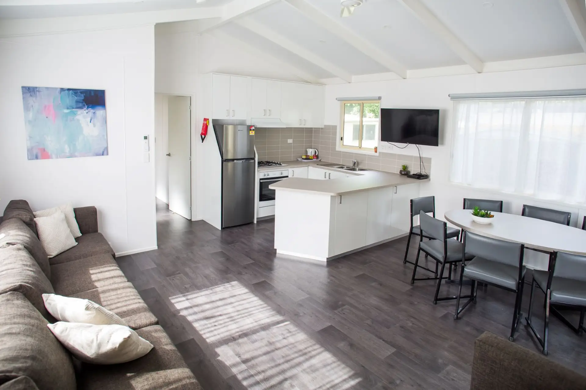 Spacious and family-friendly, the Superior 3 Bedroom Villa comfortably sleeps up to 8 guests with one queen bed, two single beds, and a single bunk across three well-appointed bedrooms. The full kitchen includes a gas stovetop, electric oven, microwave, and full-size fridge - perfect for preparing meals with ease. Unwind in the open-plan living and dining area with sofa, TV and air-conditioning, or step outside onto your private deck. With linen provided and access to an on-site EV charger, you can settle in and enjoy a truly relaxing stay.