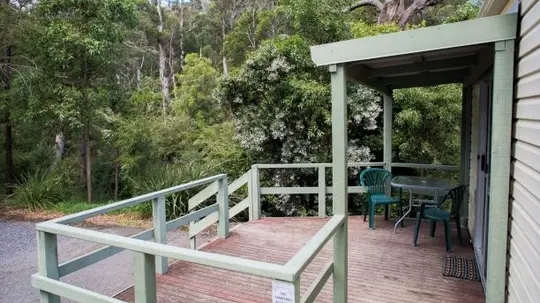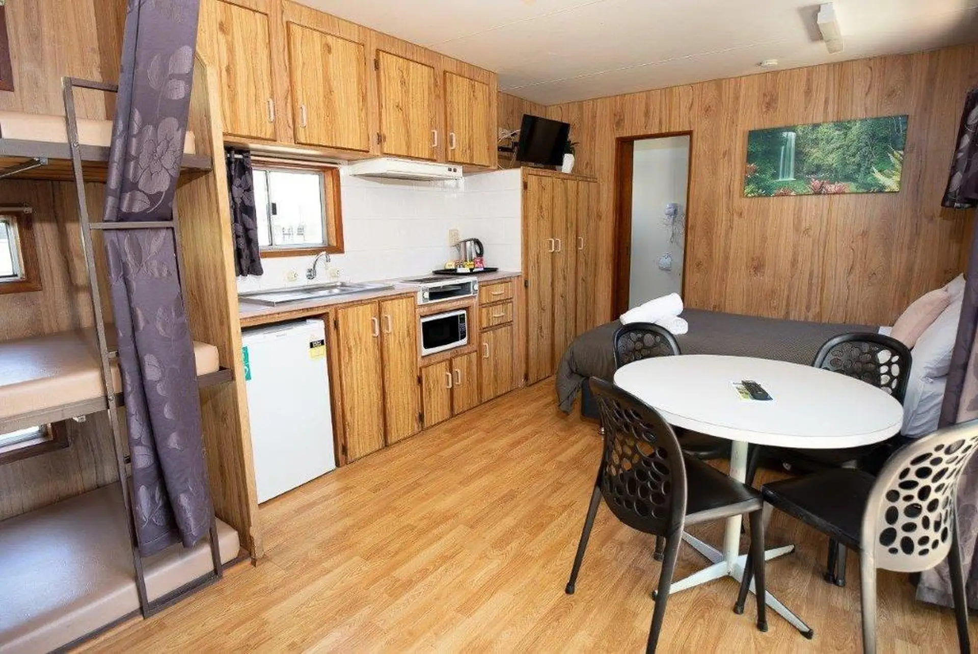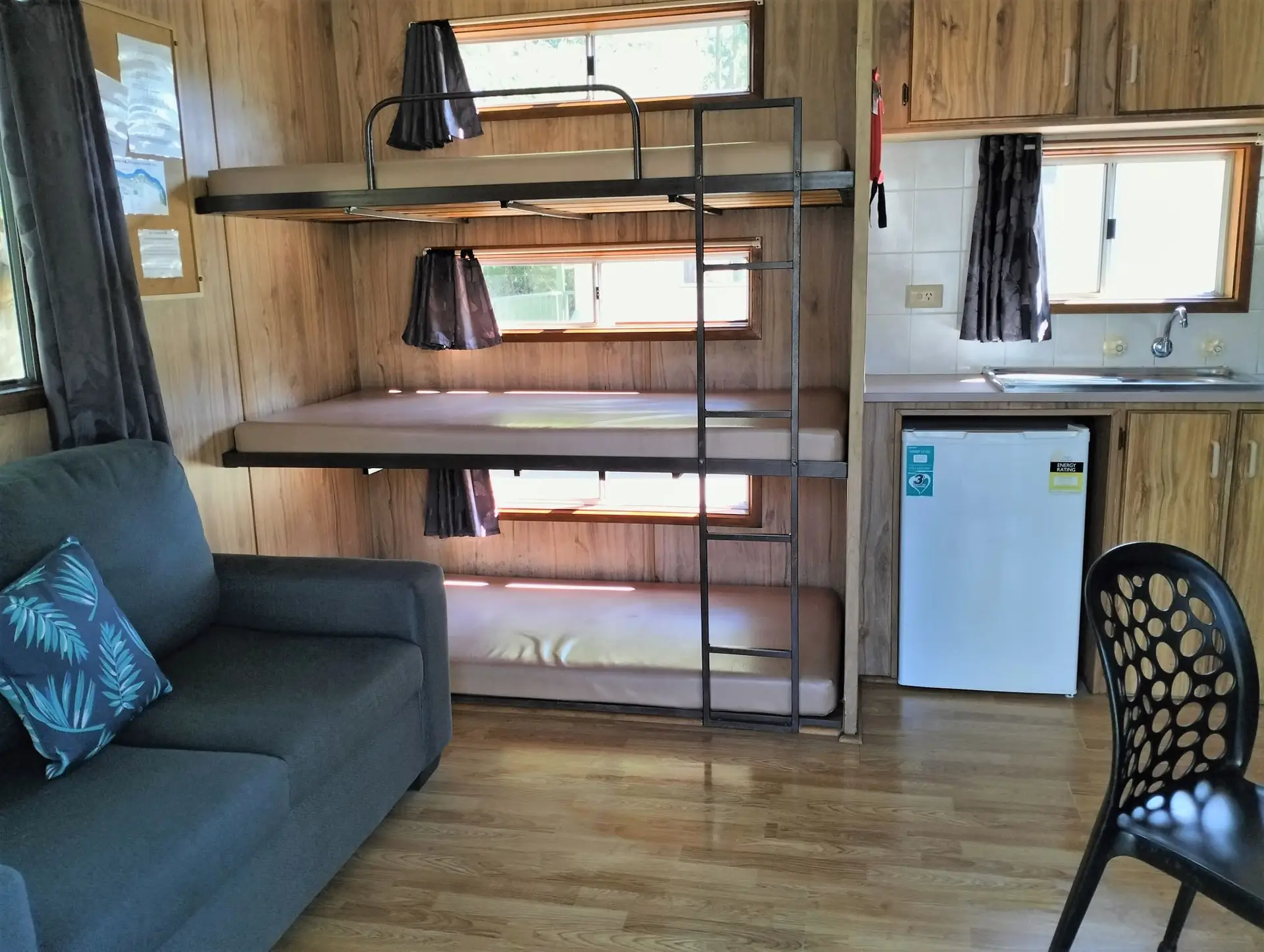 With lovely river views and a compact, open-plan layout, this studio is a great option for small families or groups. Sleeping up to 5 guests, it includes a double bed and a triple bunk bed, all in the same living space. The studio features air-conditioning, a private bathroom, TV, sofa, and dining area. A convenient kitchenette is equipped with an electric stovetop, microwave, and bar fridge - perfect for light meals. Step outside to enjoy the fresh air from your private deck. All linen is provided.