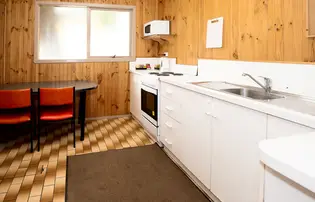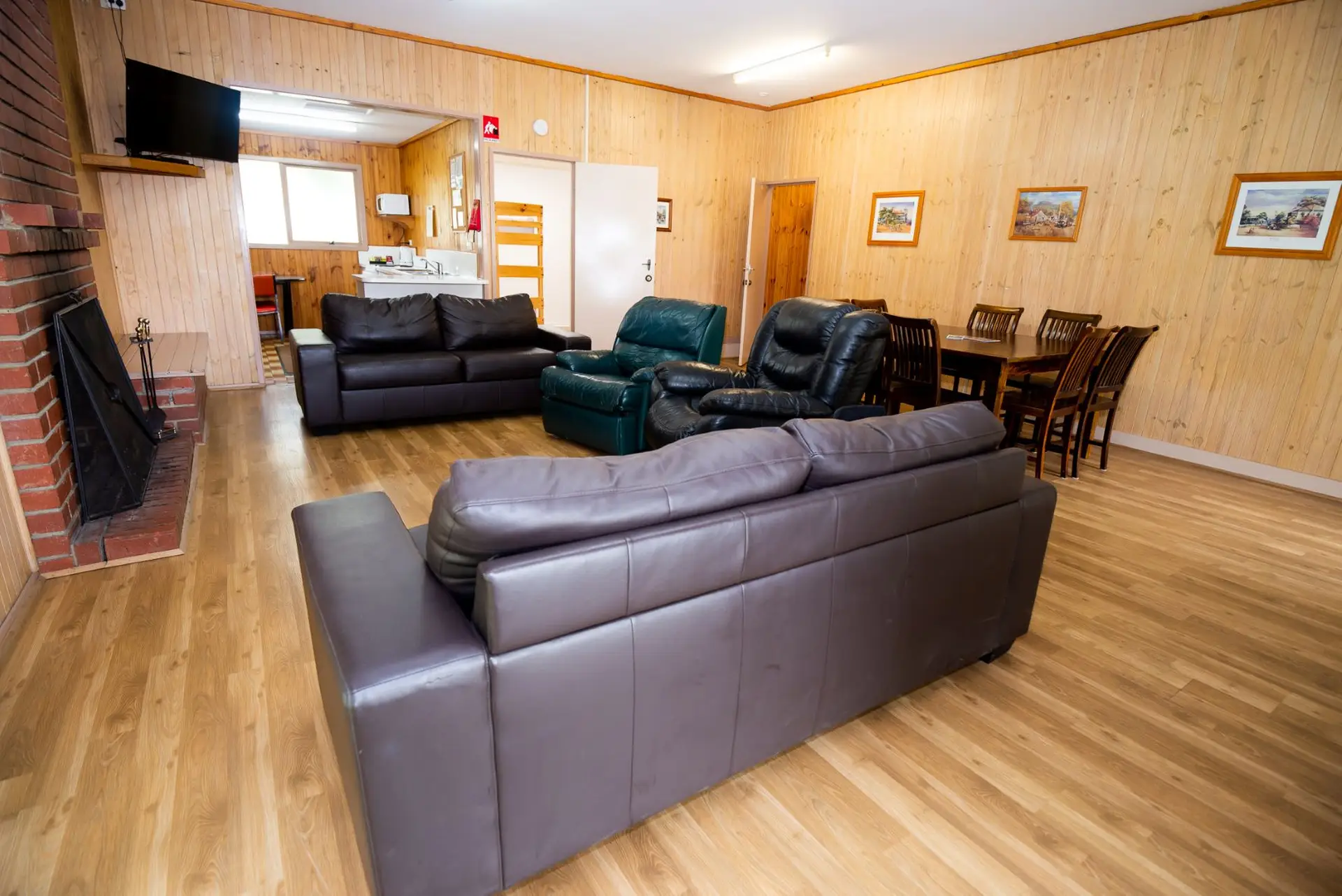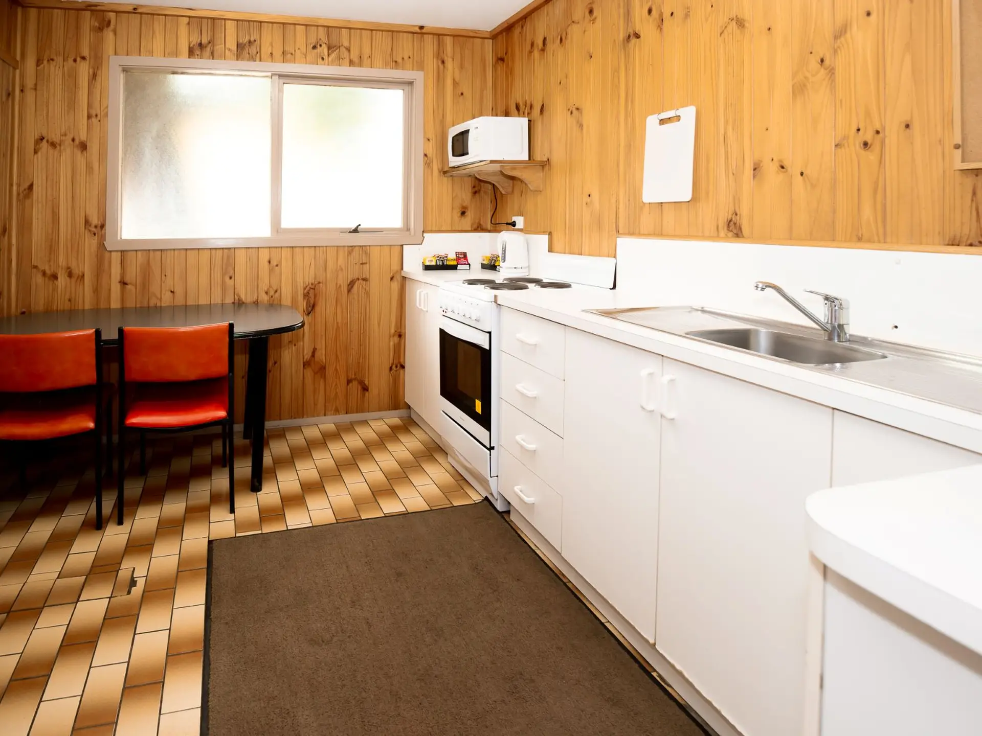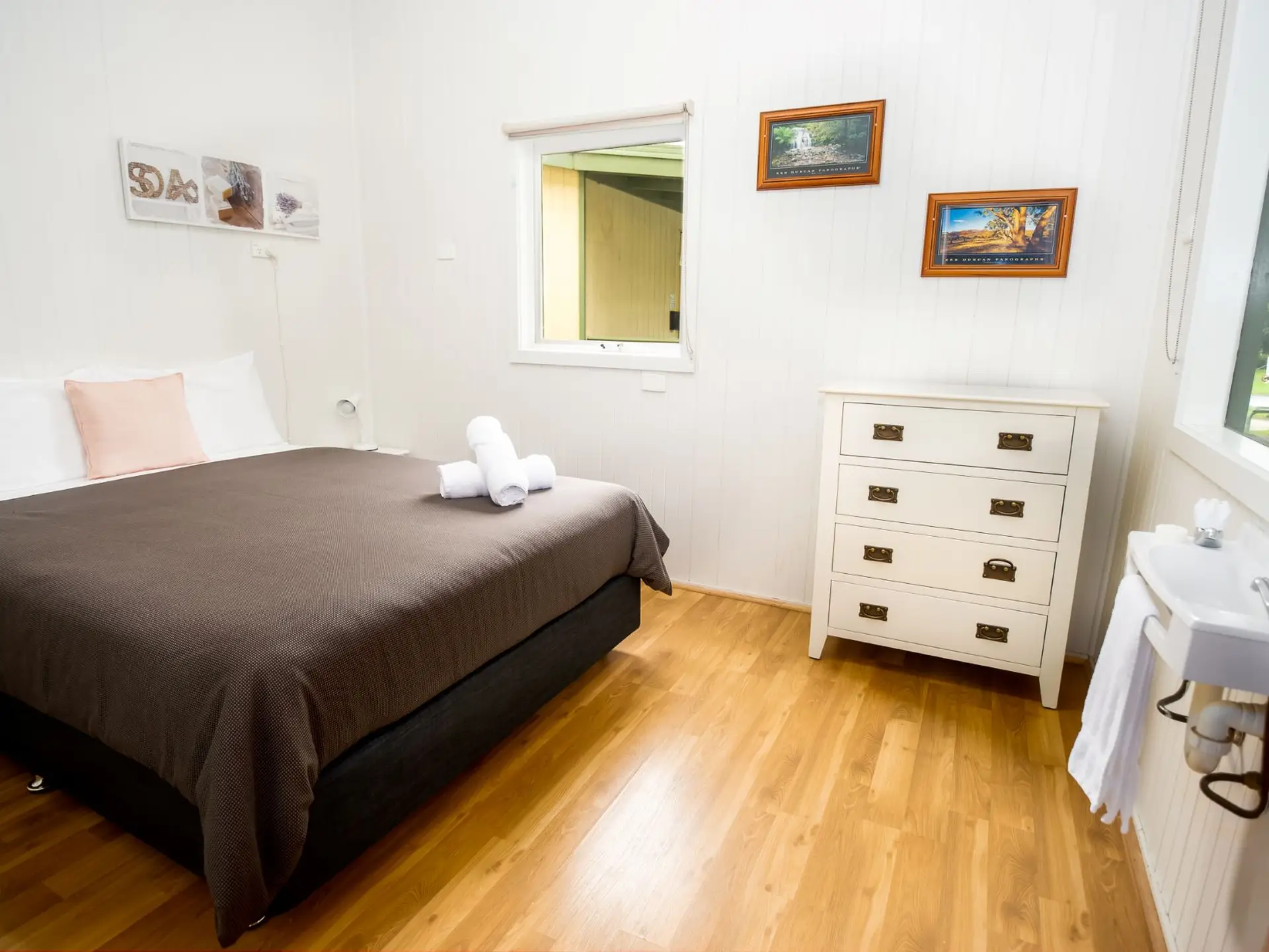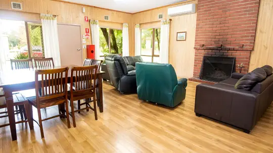 Perfect for families or groups, this cabin sleeps up to 8 guests with a queen bed in one room and two sets of single bunks in the other. There’s plenty of space to unwind, with an open-plan living area that includes a dining table and chairs, TV, sofa, and air-conditioning to keep you comfortable year-round. Cook up your favourites in the fully equipped kitchen with gas stovetop, electric oven, microwave, and full-size fridge. With a private bathroom and linen provided, everything’s set for a fuss-free, laid-back stay.