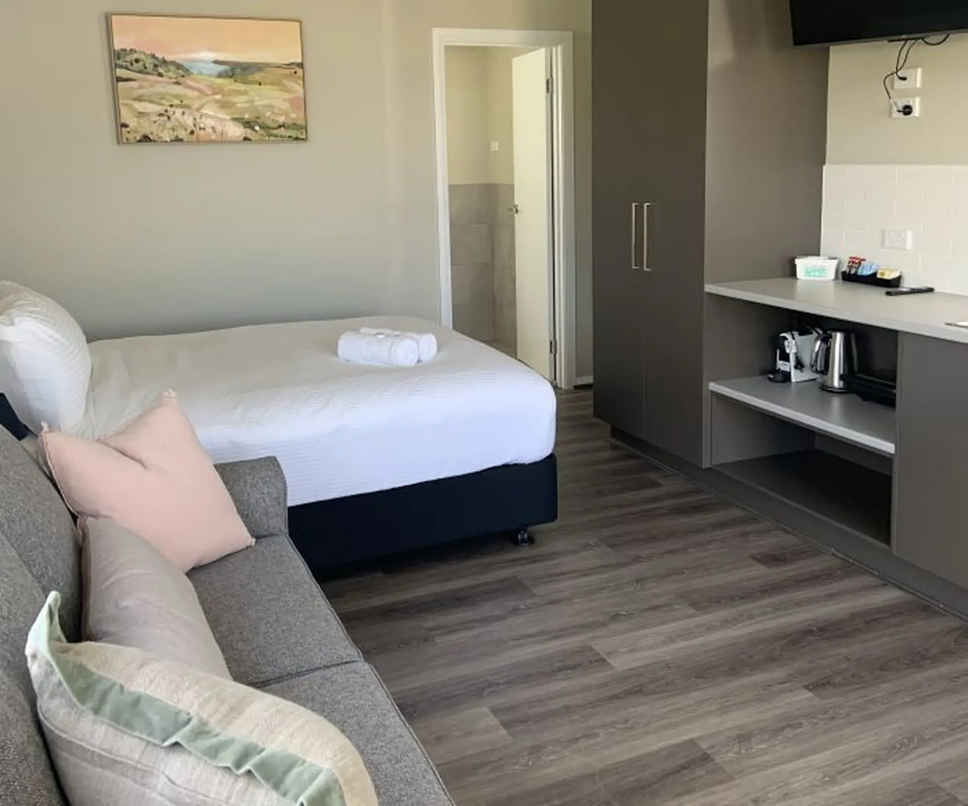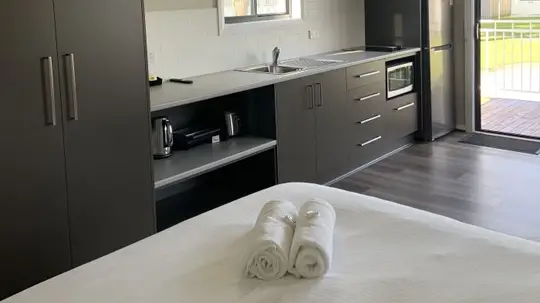 Designed for couples, this bright and modern studio cabin features an open-plan layout with a queen bed, ensuite bathroom, and air-conditioned comfort. The well-equipped kitchenette includes an oven, stovetop, microwave and full-size fridge. Enjoy a relaxed stay with TV and a private verandah, perfect for unwinding after a day at the beach.