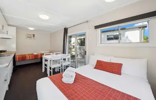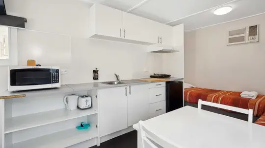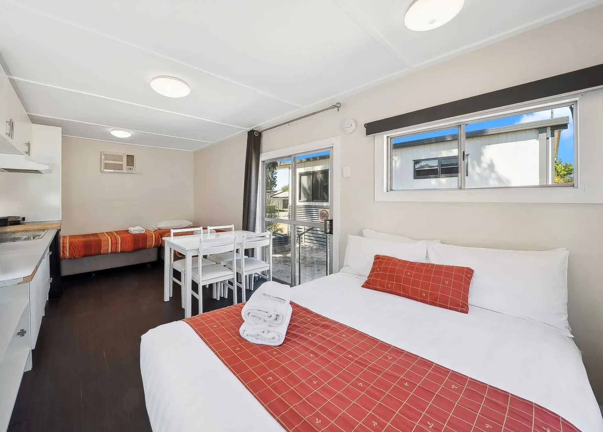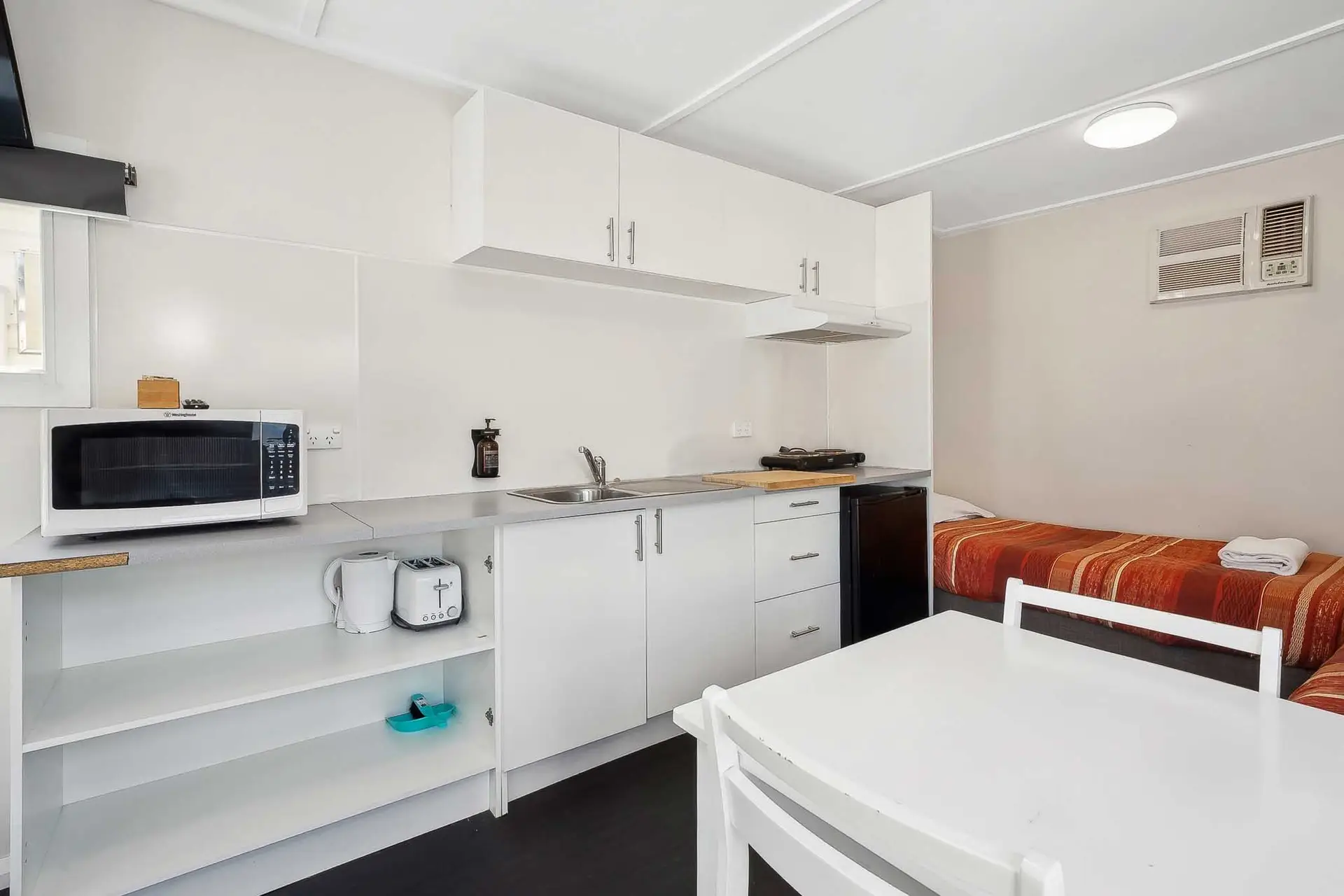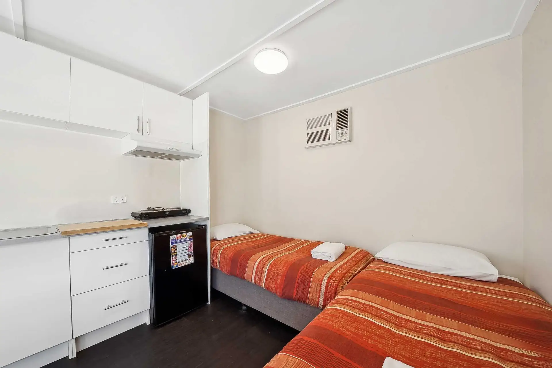 This open-plan studio sleeps up to four with a double bed and two singles—ideal for couples, solo travellers, or workers. A compact kitchenette, dining setting, TV, and reverse cycle air-conditioning provide everyday comfort. While there’s no private bathroom, guests enjoy easy access to clean shared amenities. With linen provided and a relaxed atmosphere, it’s a great-value stay.