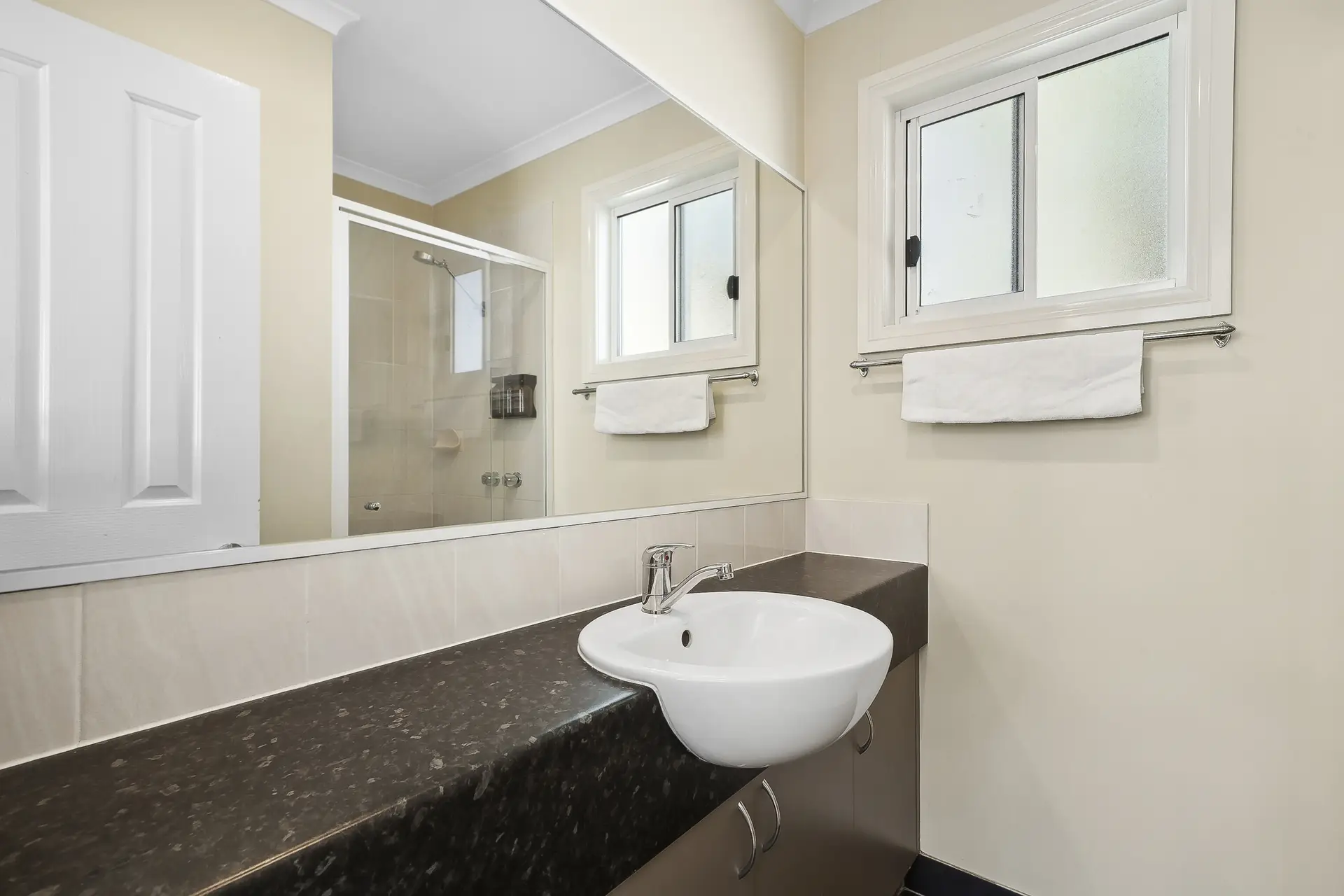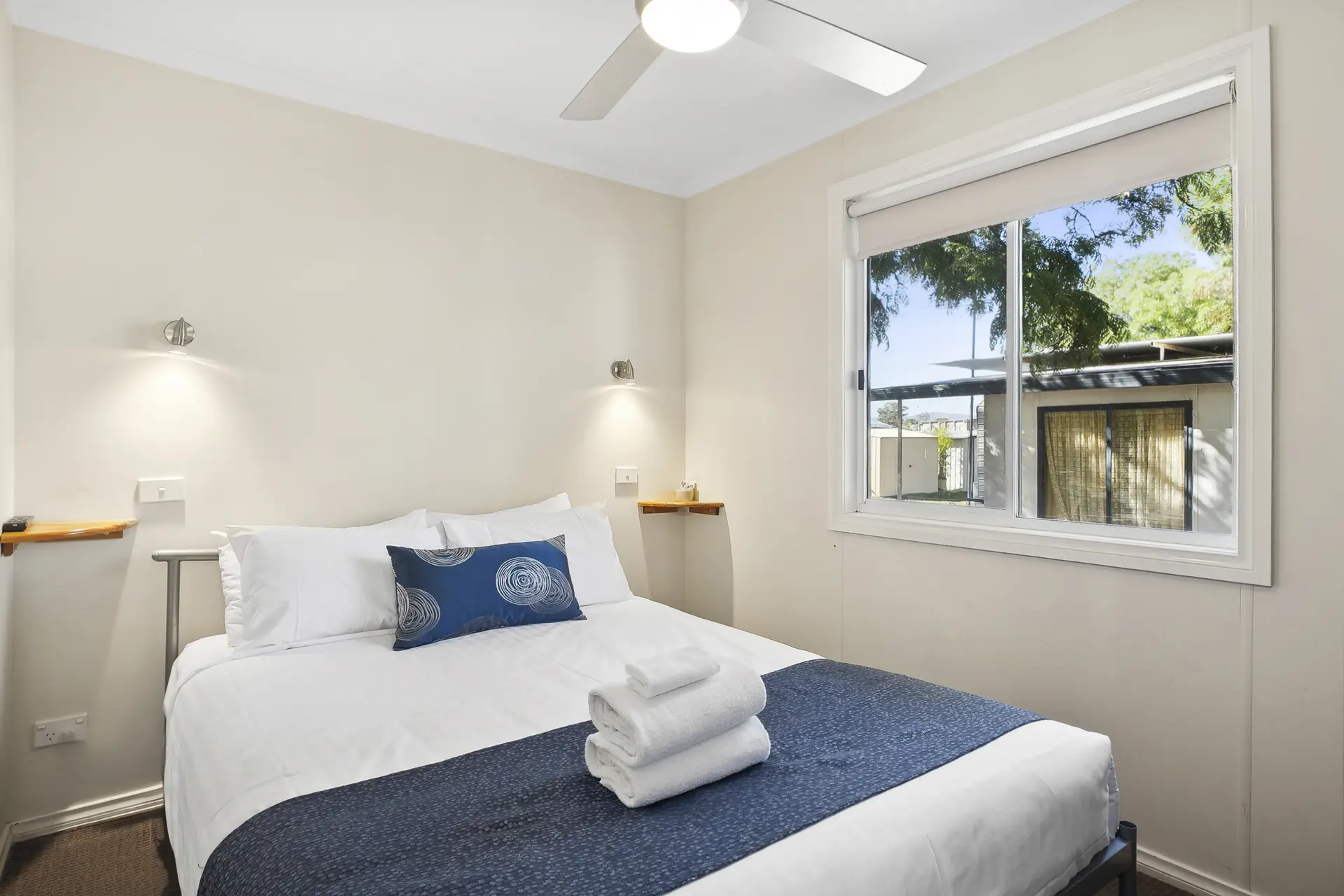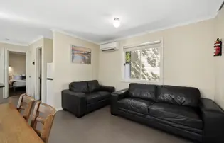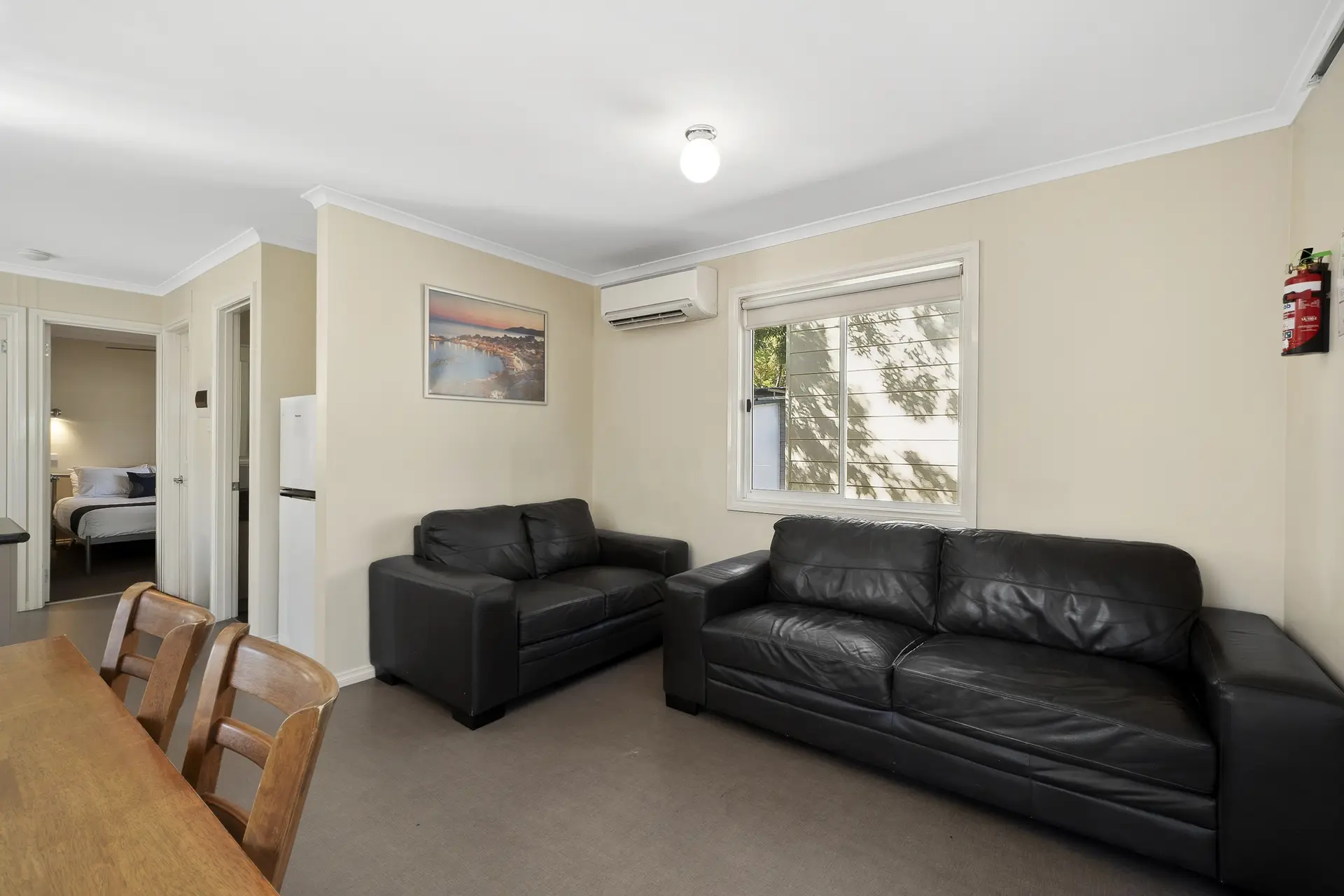 Steps from the pool, this bright two-bedroom villa sleeps up to four with a queen bed and single bunks. The full kitchen and spacious living area with leather lounges, dining table, and TV/DVD offer all the comforts of home. A private bathroom, separate toilet, and air conditioning ensure convenience. Relax on the large verandah with a six-seat outdoor setting overlooking the pool—perfect for family downtime.