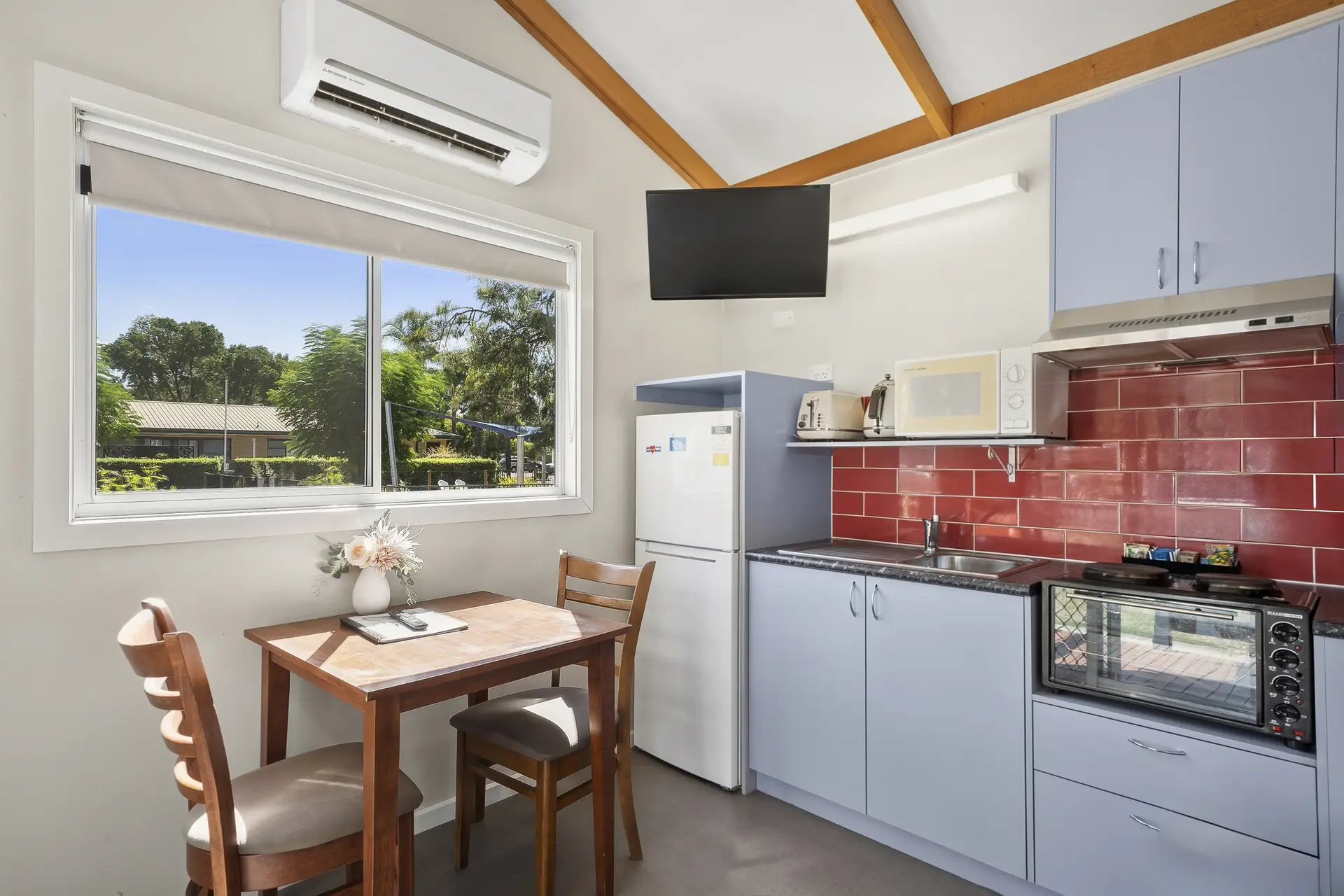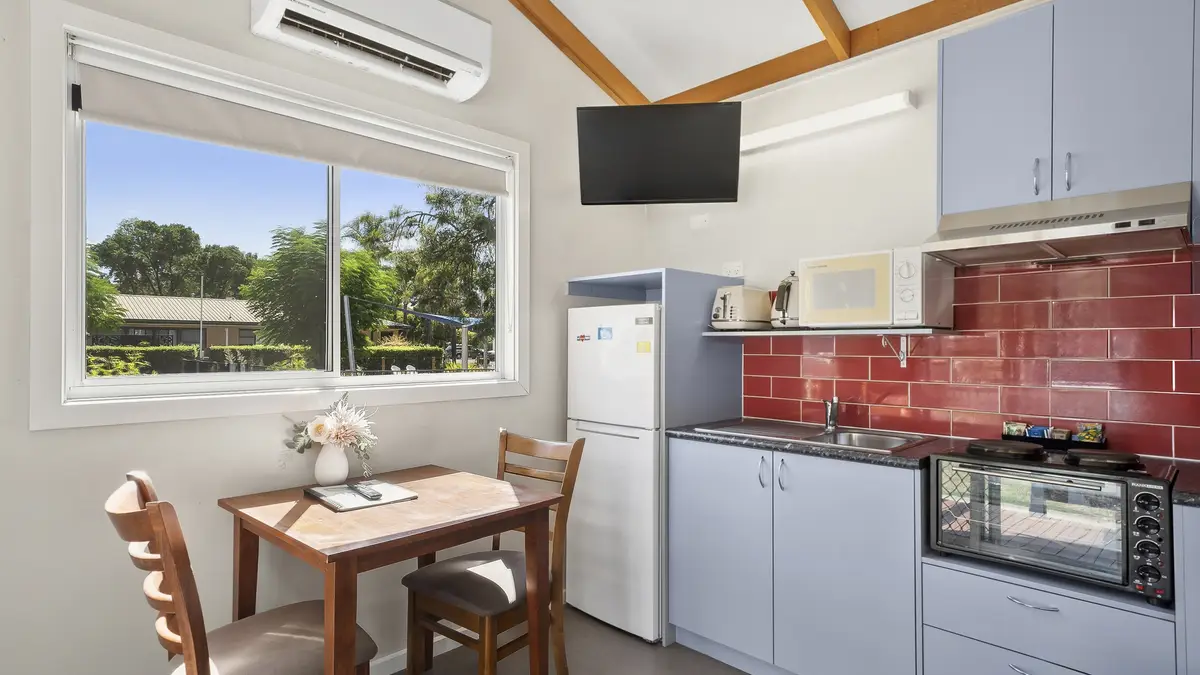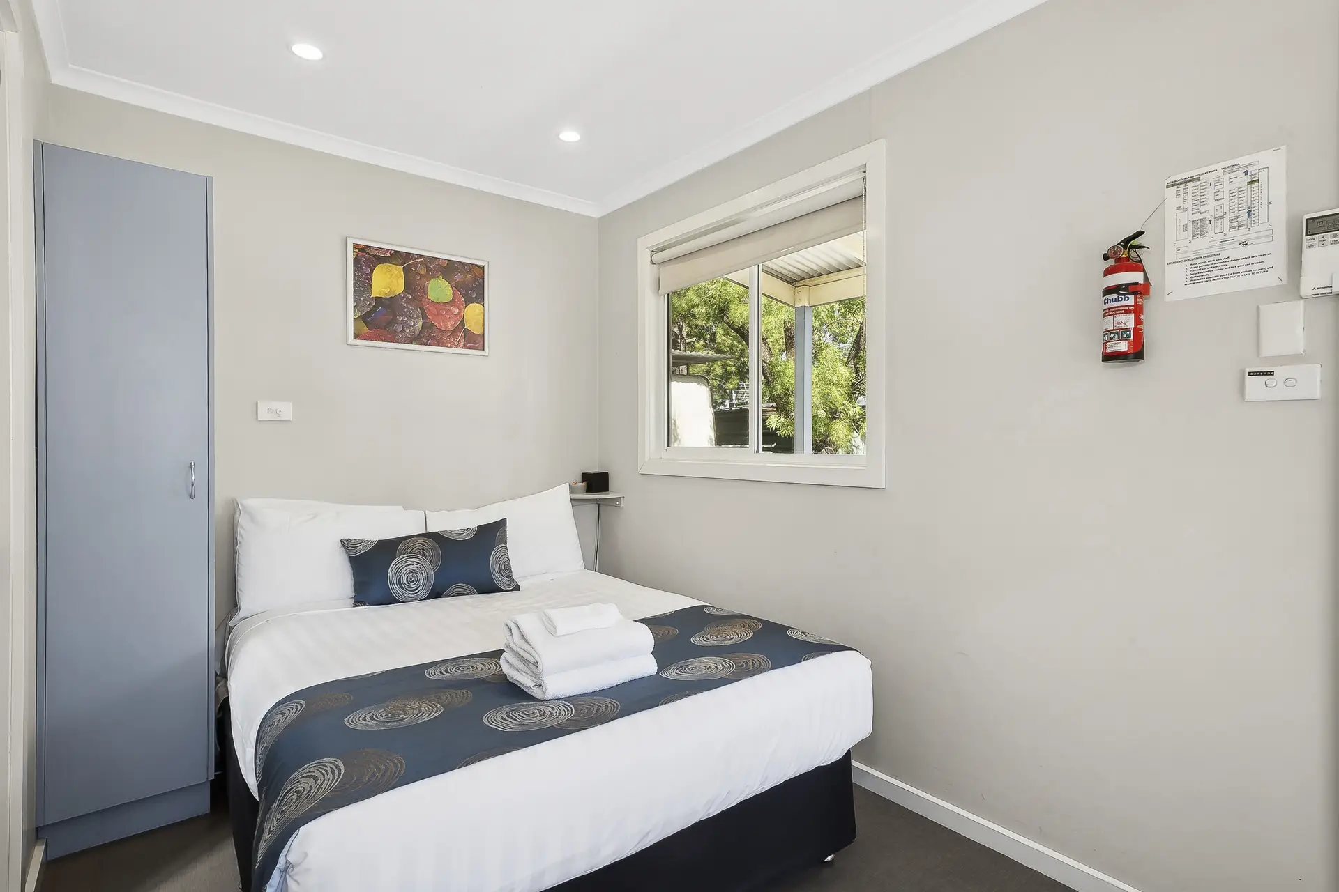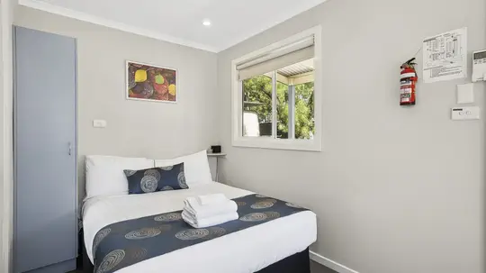 Perfect for solo travellers or couples, this poolside studio features a comfy double bed in an open-plan layout. Enjoy a well-equipped kitchenette, dining table, TV, and ceiling fan. The private verandah with outdoor seating overlooks the pool—ideal for morning coffee or sunset relaxation. With air conditioning, heating, and linen provided, it’s a great value escape in a scenic setting.
