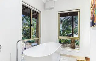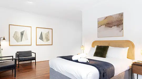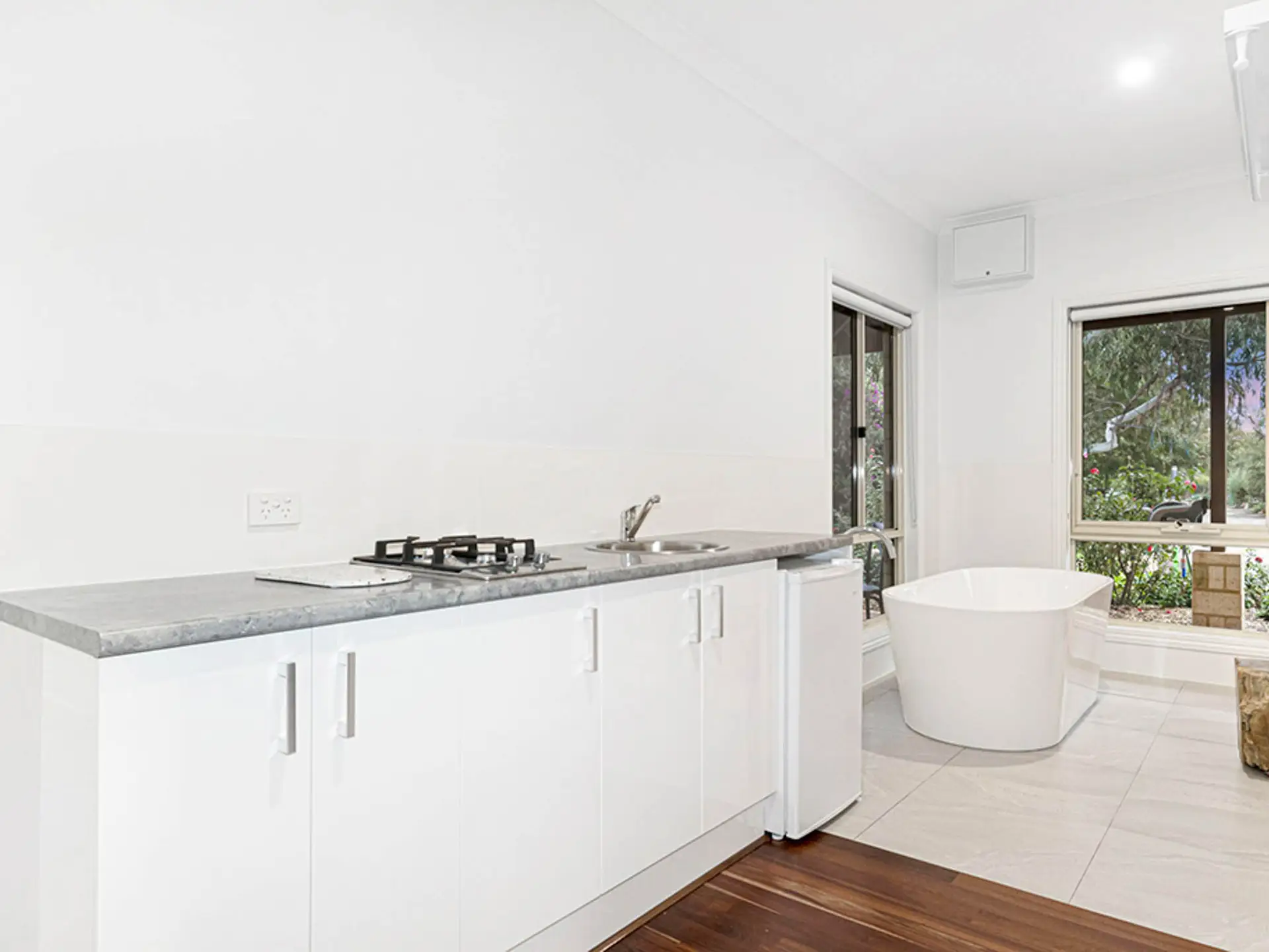 This modern one-bedroom cabin sleeps two guests in a cosy double bed and features an accessible layout with a roll-in shower. Enjoy a light kitchenette with a microwave, gas stovetop, and bar fridge, plus a private ensuite with full-size bath. Stay comfortable year-round with air-conditioning and heating, and take in the surroundings from your verandah.