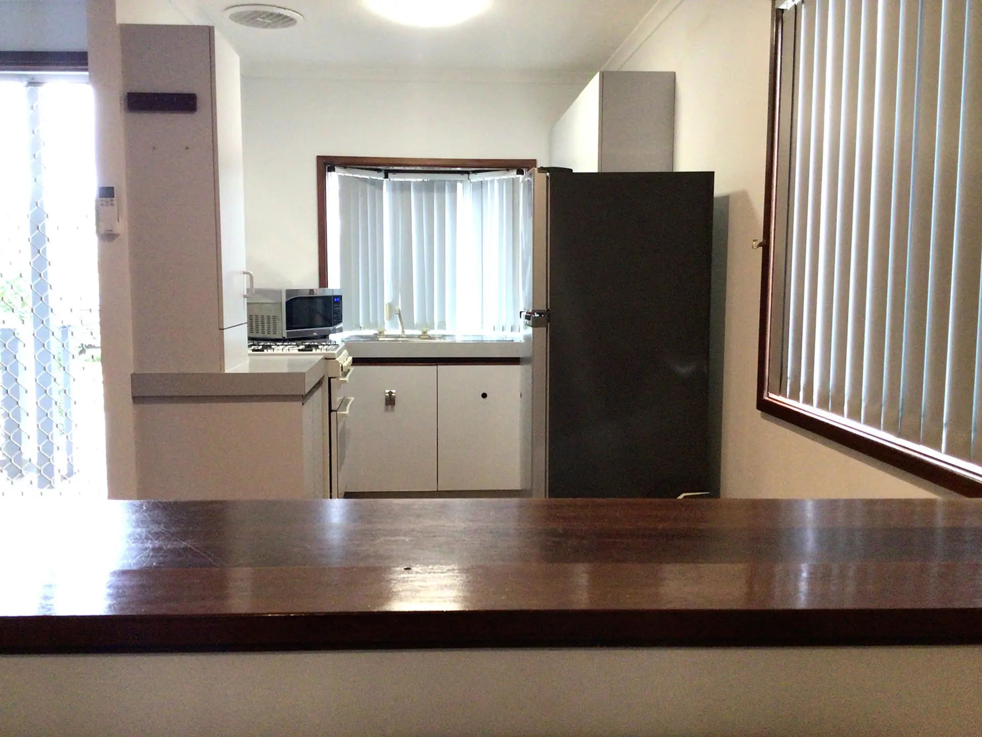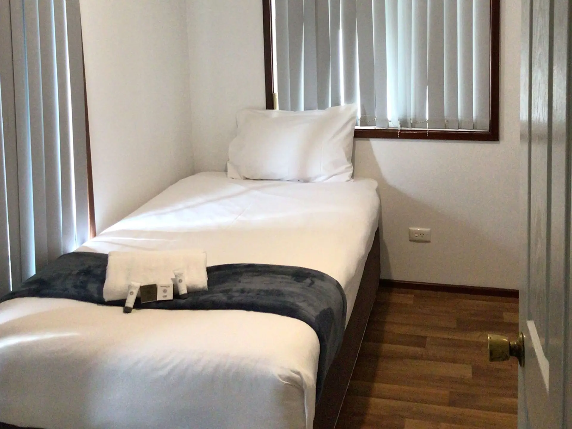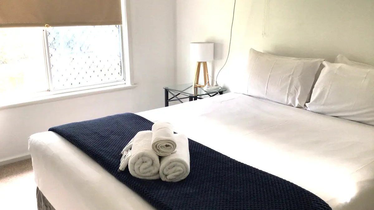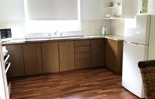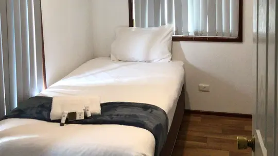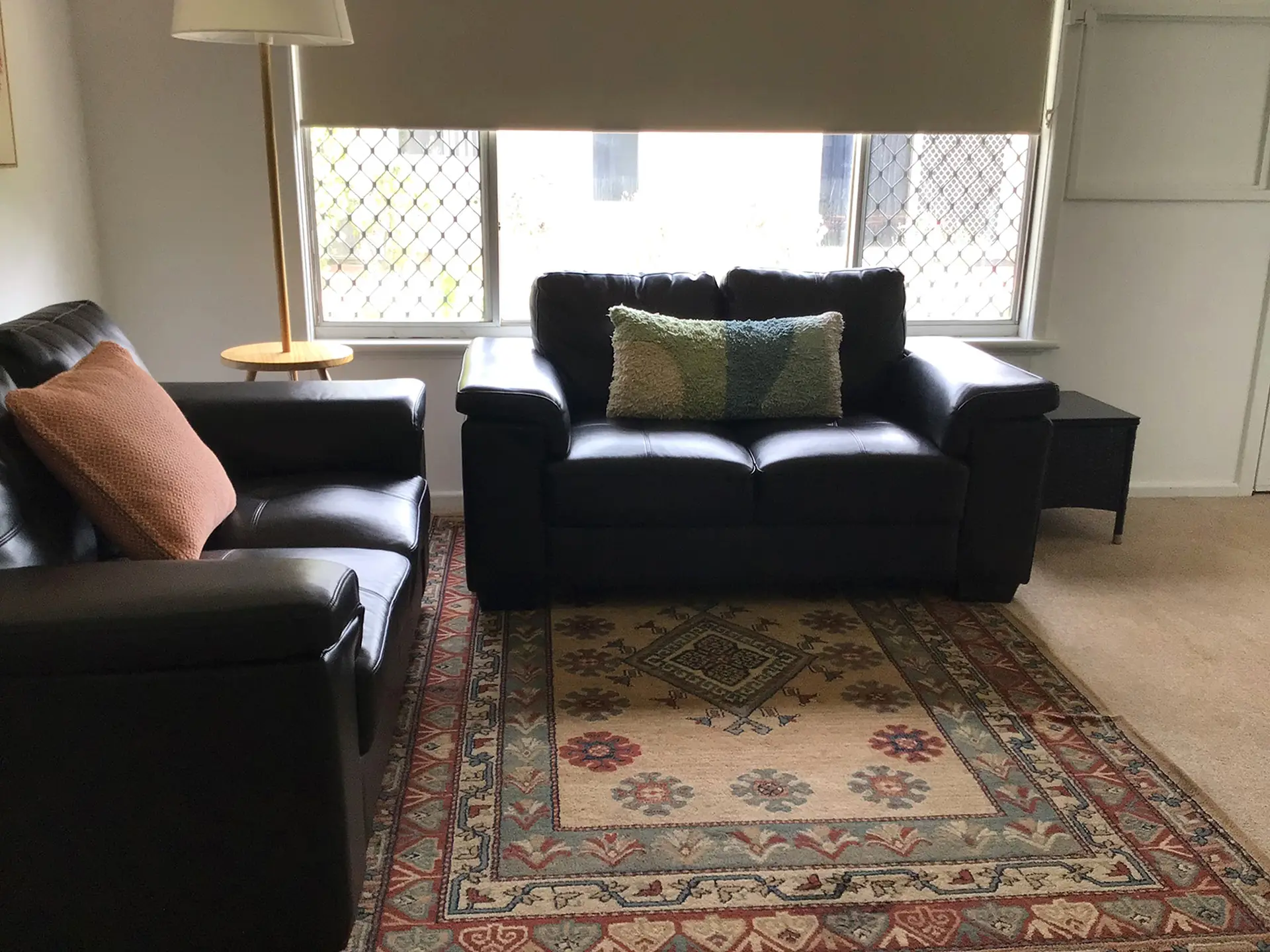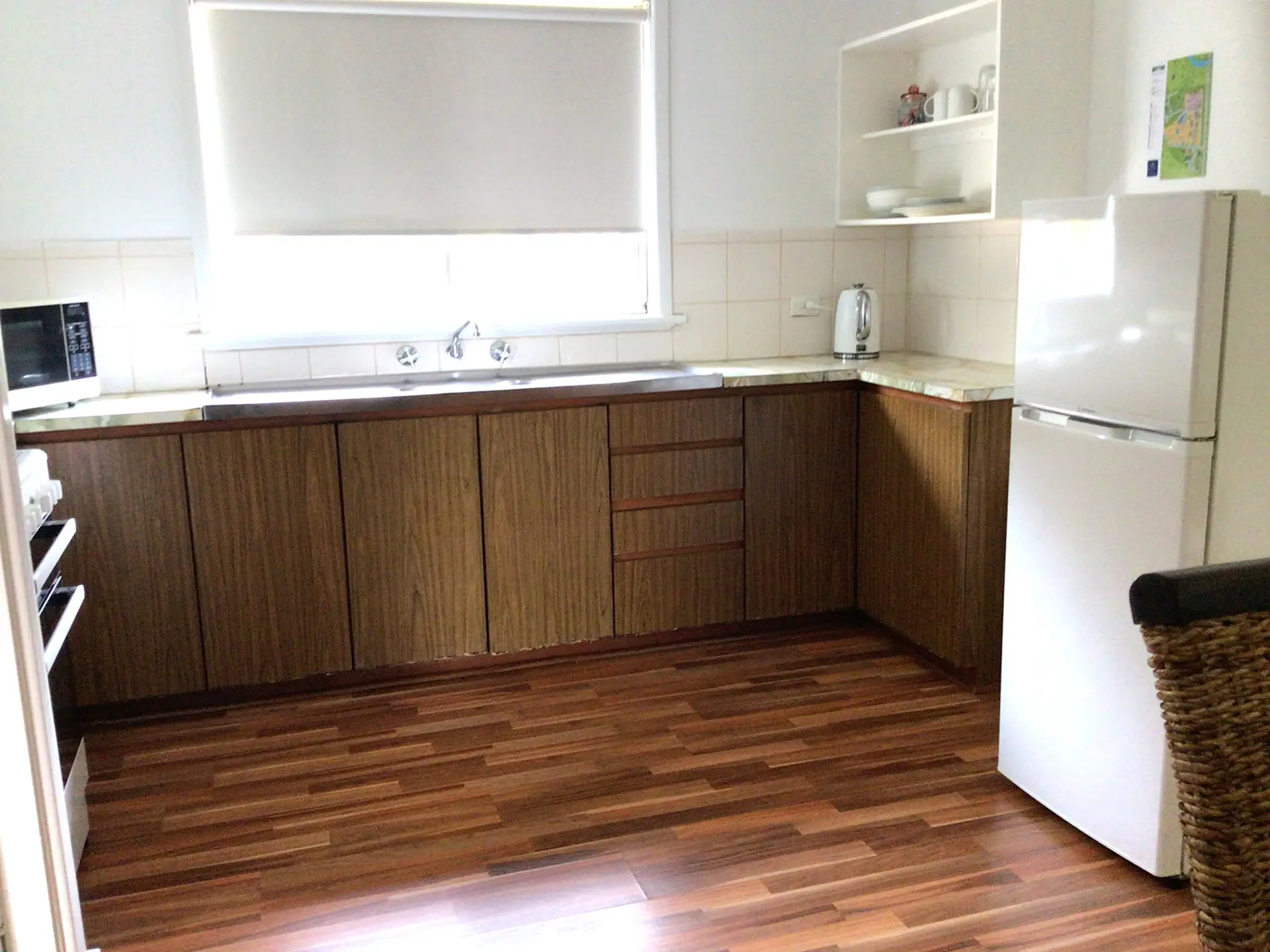 This two-bedroom house sleeps up to three guests with one double bed and one single bed. It includes a full kitchen with gas oven, microwave, and full-size fridge, plus a dining area and air-conditioned living space. Guests have access to a private bathroom, outdoor setting, and verandah.