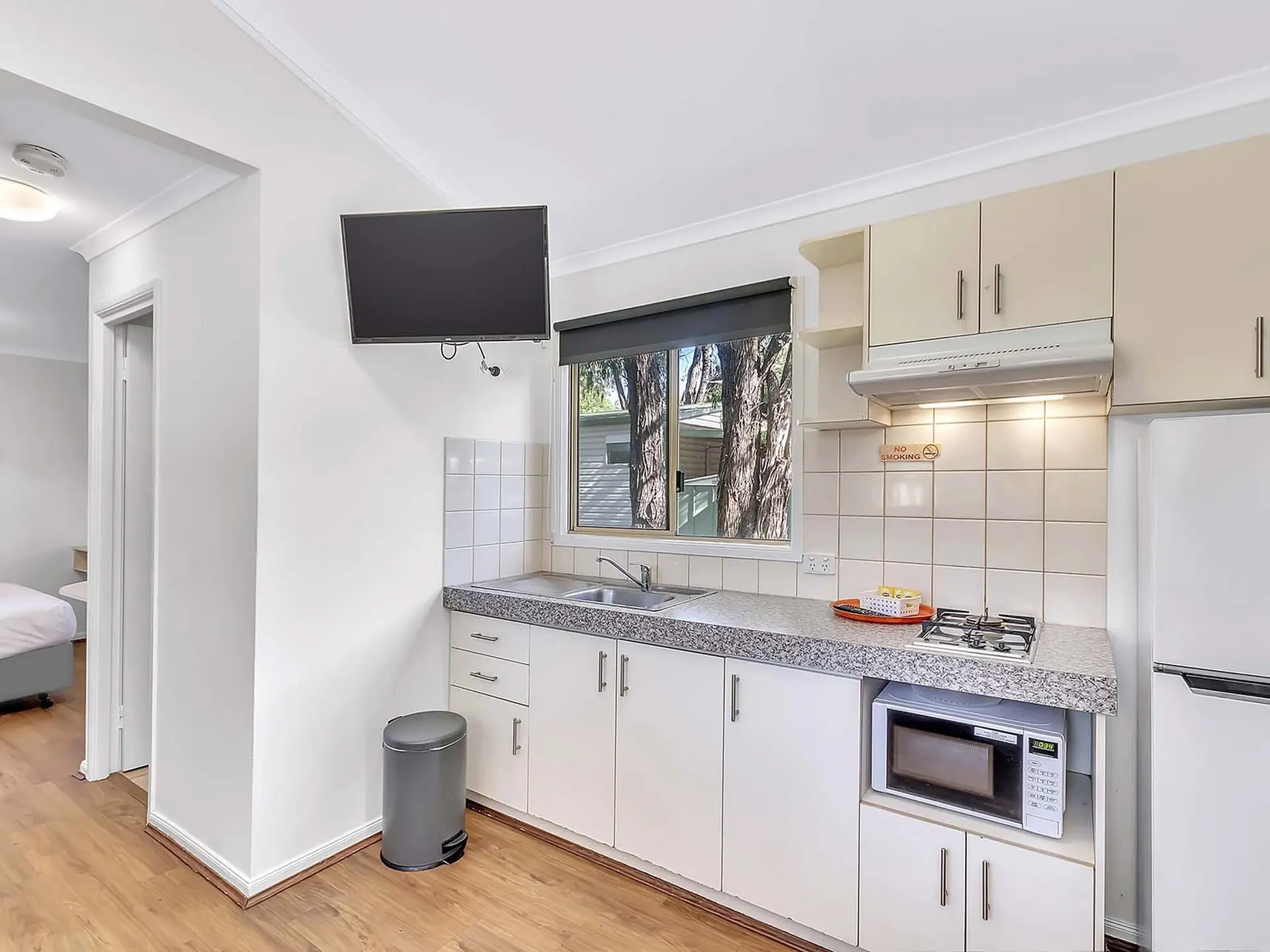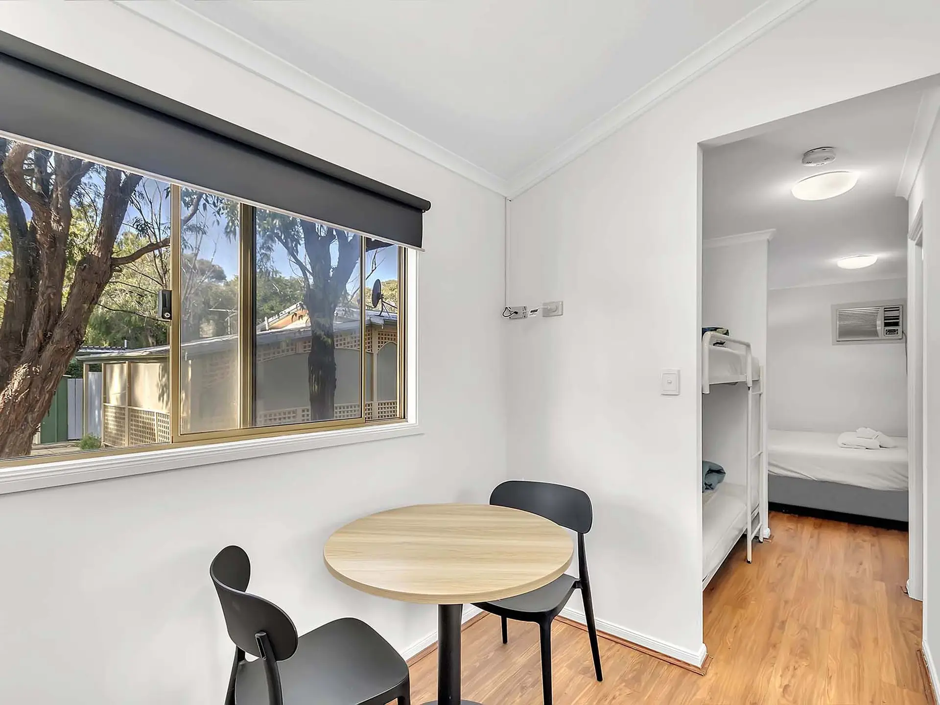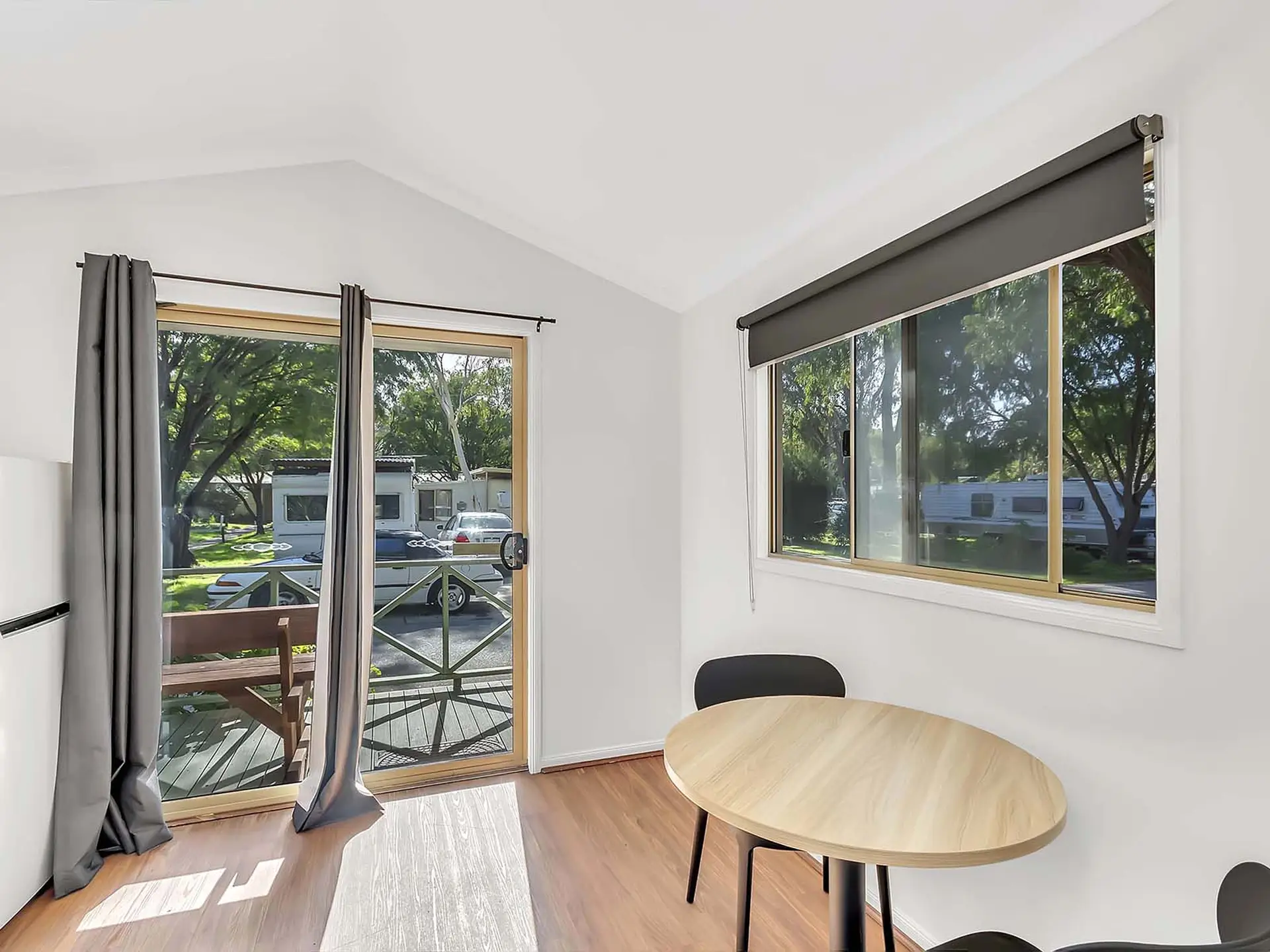 This one-bedroom cabin sleeps up to four guests with a queen bed and a set of single bunks. The open-plan layout includes a kitchenette with electric oven, stovetop, microwave, and full-size fridge, as well as a dining area and TV. The cabin also features a private bathroom and air-conditioning for year-round comfort.