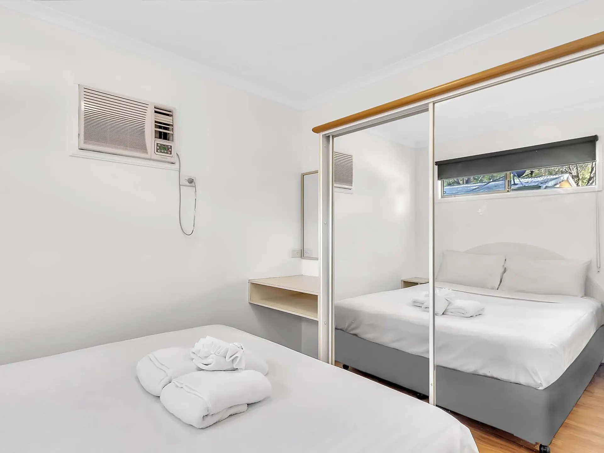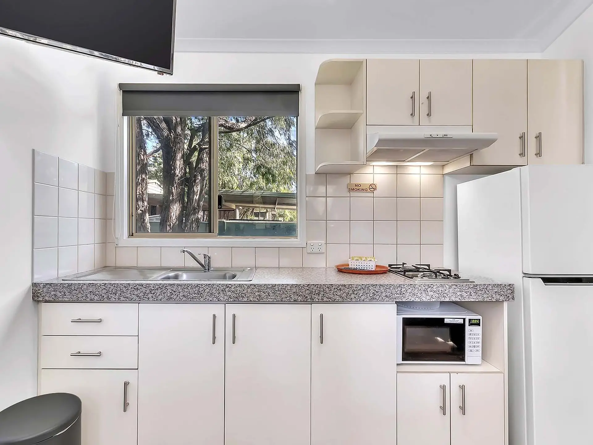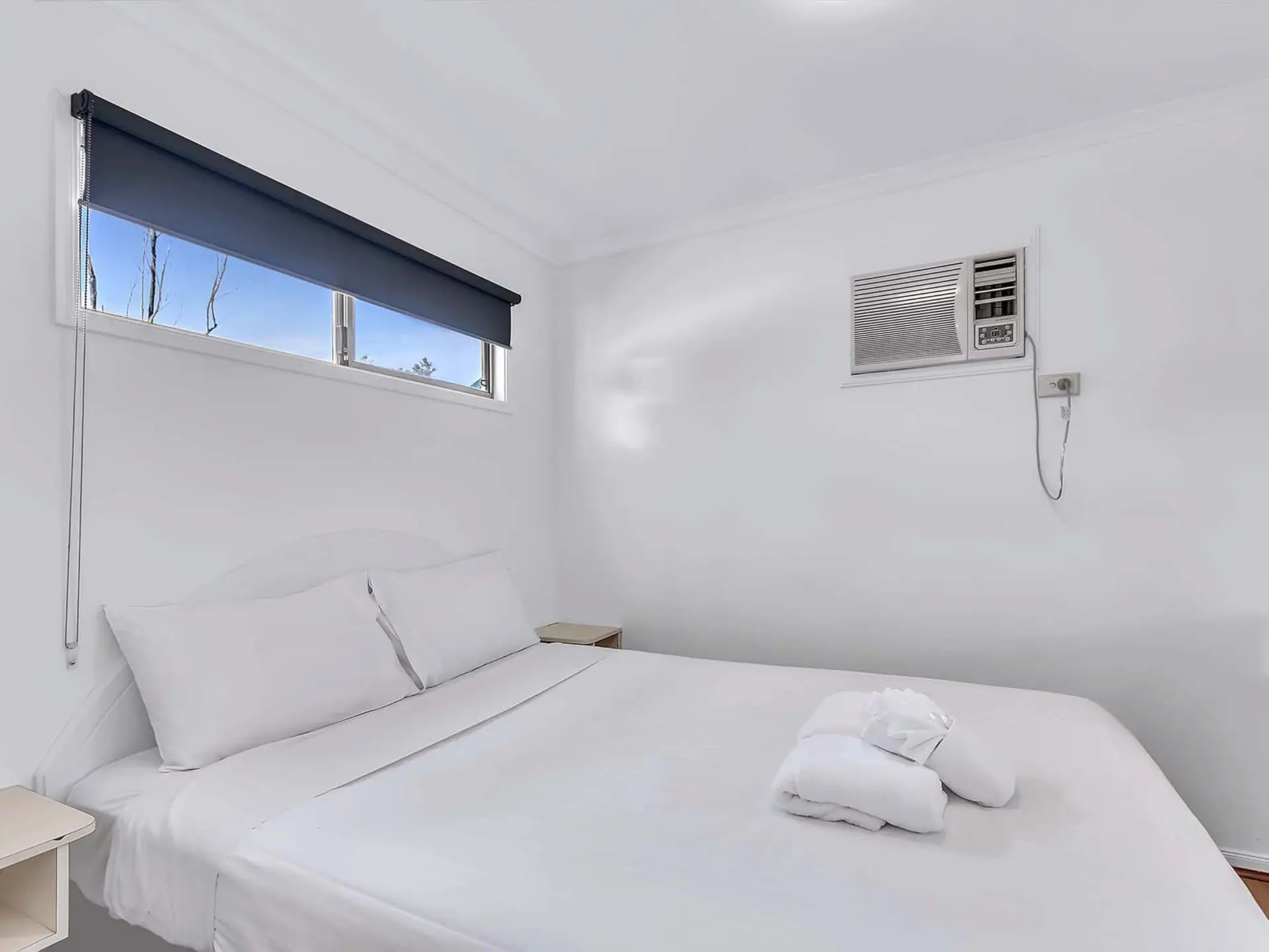 This one-bedroom cabin sleeps up to four guests with a queen bed and a set of single bunks. The open-plan layout includes a kitchenette with electric oven, stovetop, microwave, and full-size fridge, as well as a dining area and TV. The cabin also features a private bathroom and air-conditioning for year-round comfort.