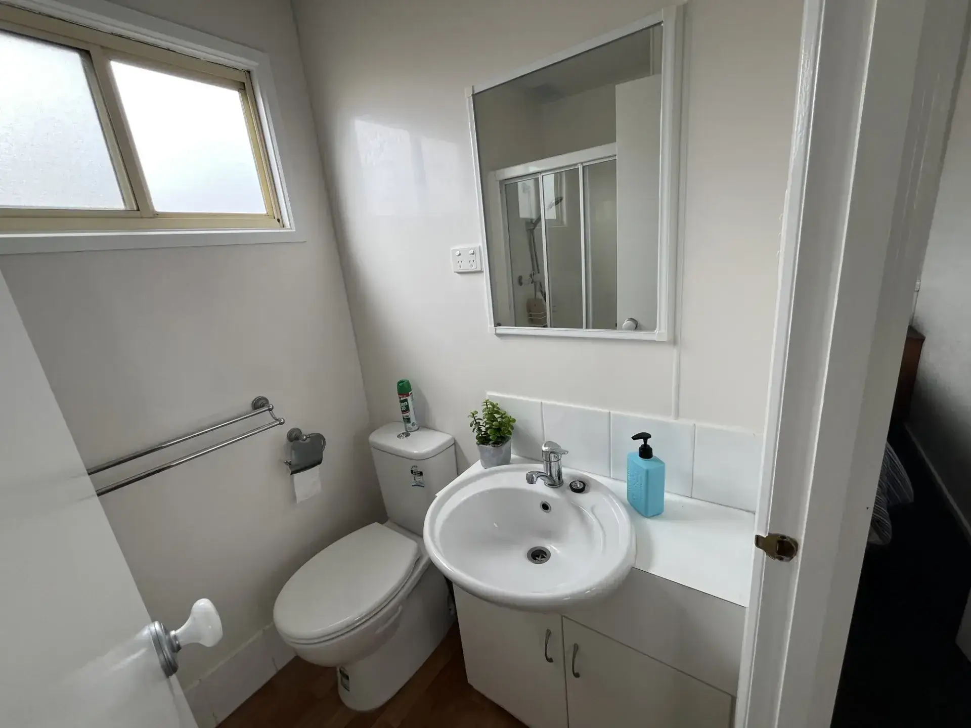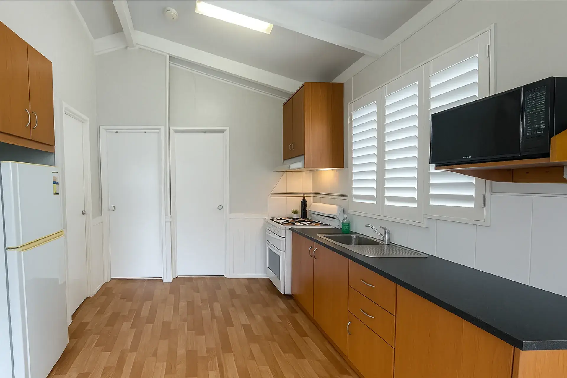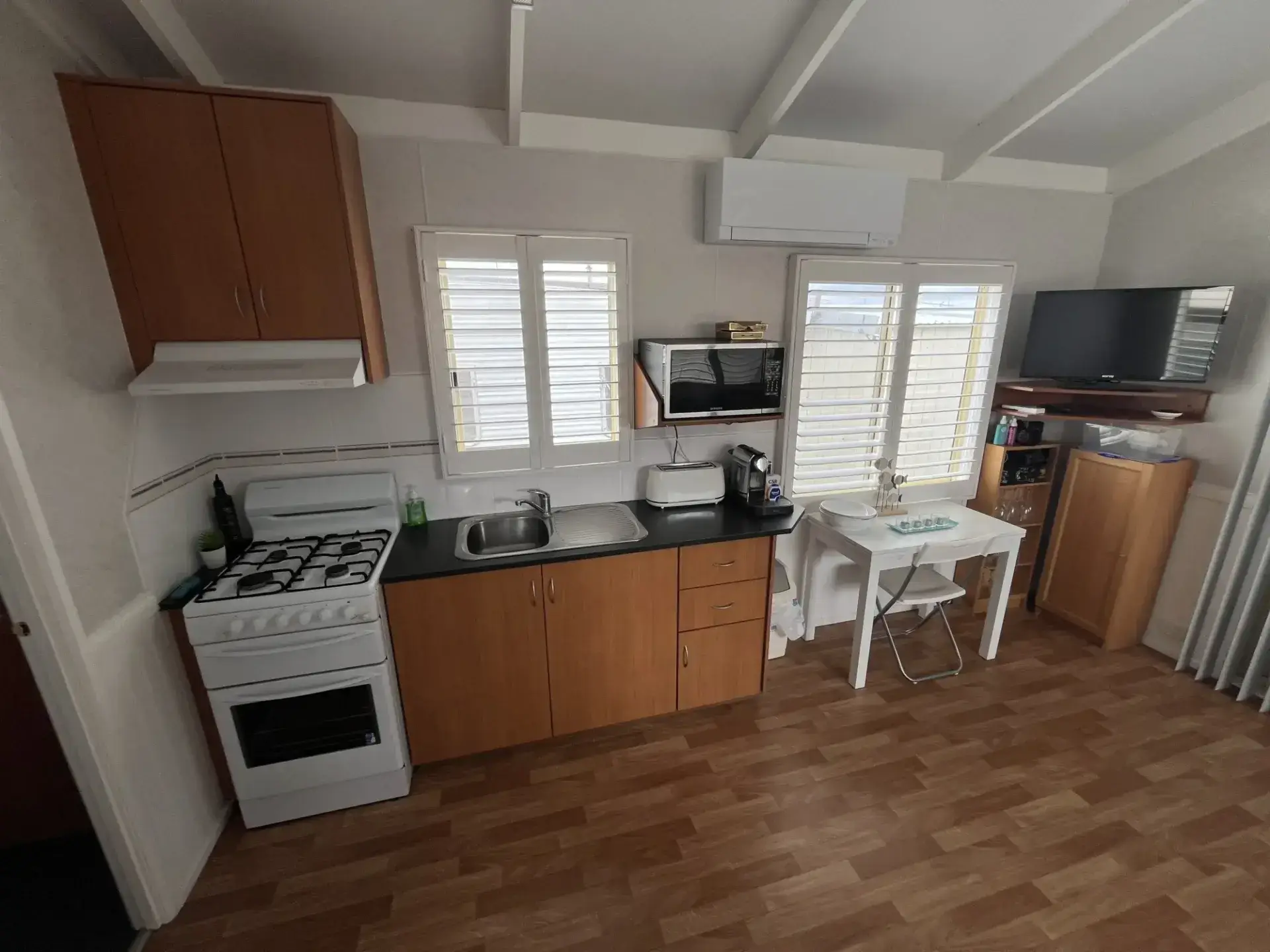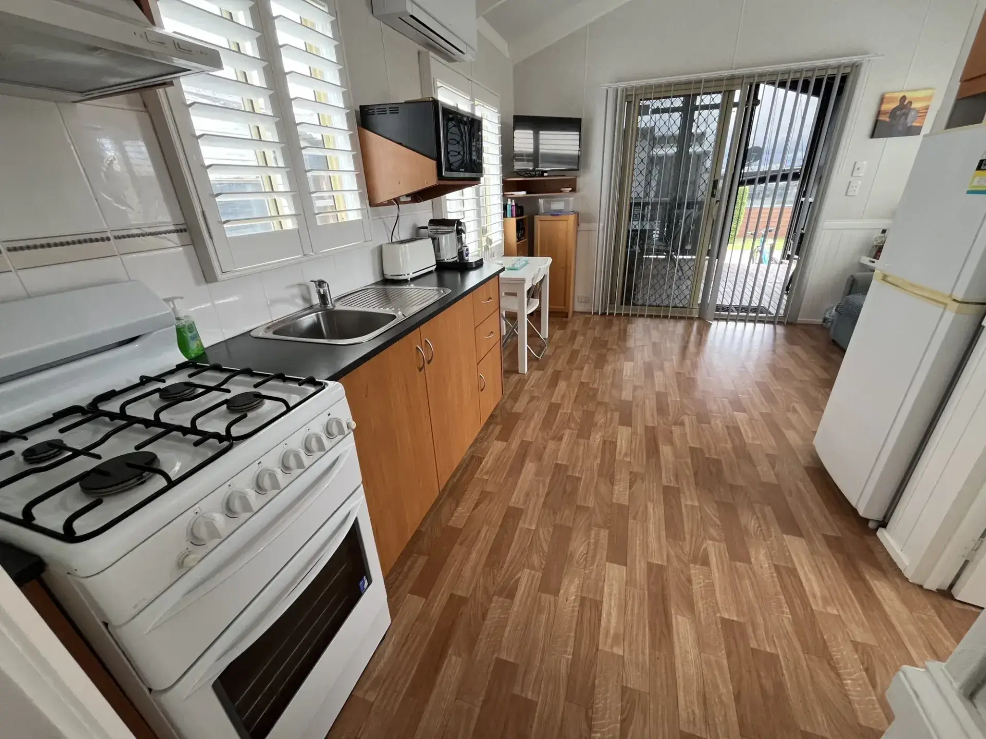 The open-plan kitchen and dining area gives the space an airy, welcoming feel, complete with a gas cooktop and oven that make holiday cooking easy. The bathroom is neat and functional with a shower and toilet, while the new reverse-cycle air-conditioning keeps the whole cabin perfectly comfortable year-round. The large verandah — fitted with privacy blinds — is truly the hero, giving you a lovely indoor-outdoor flow.