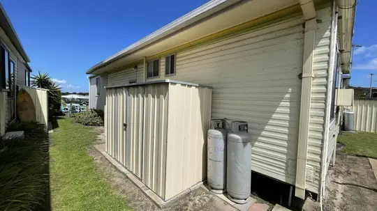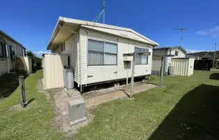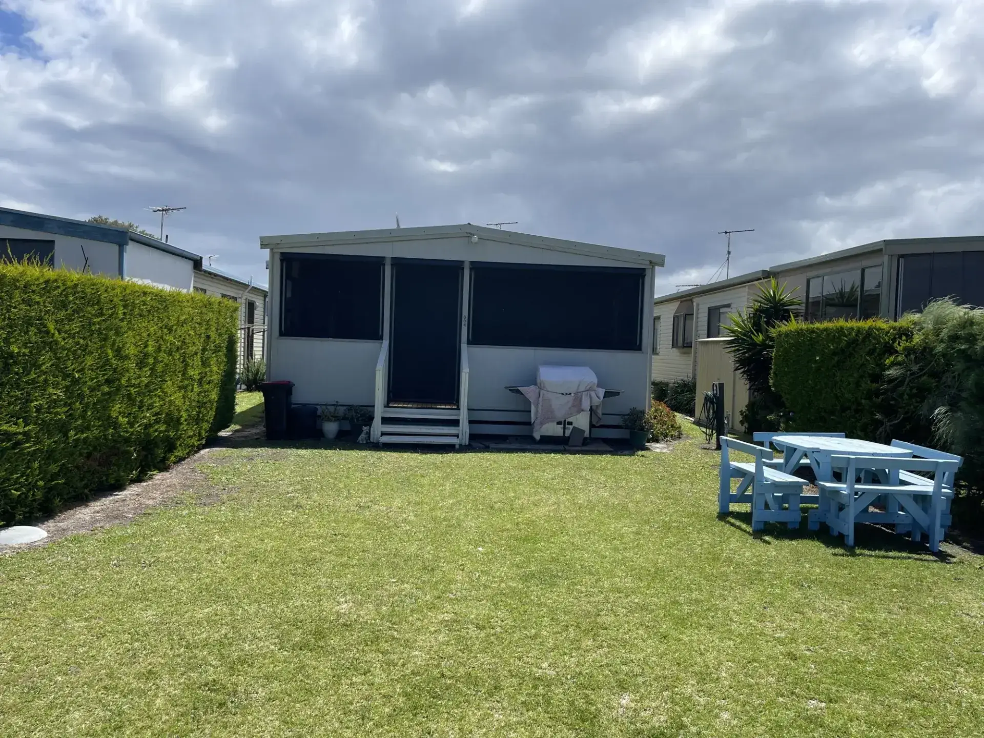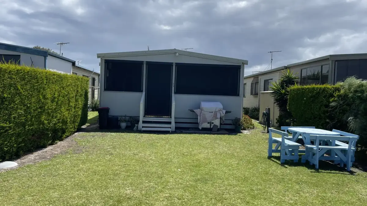 Sitting pretty on a large private site and overlooking a spread of open green space, this 2-bedroom cabin is the kind of find people circle the park hoping to spot. The layout is generous, welcoming, and designed for easy holiday living — combined lounge and dining, separate toilet, full laundry, and a deck that just begs for long afternoons. It’s older-style, sure, but kept in genuinely great condition — the kind that stands the test of time.