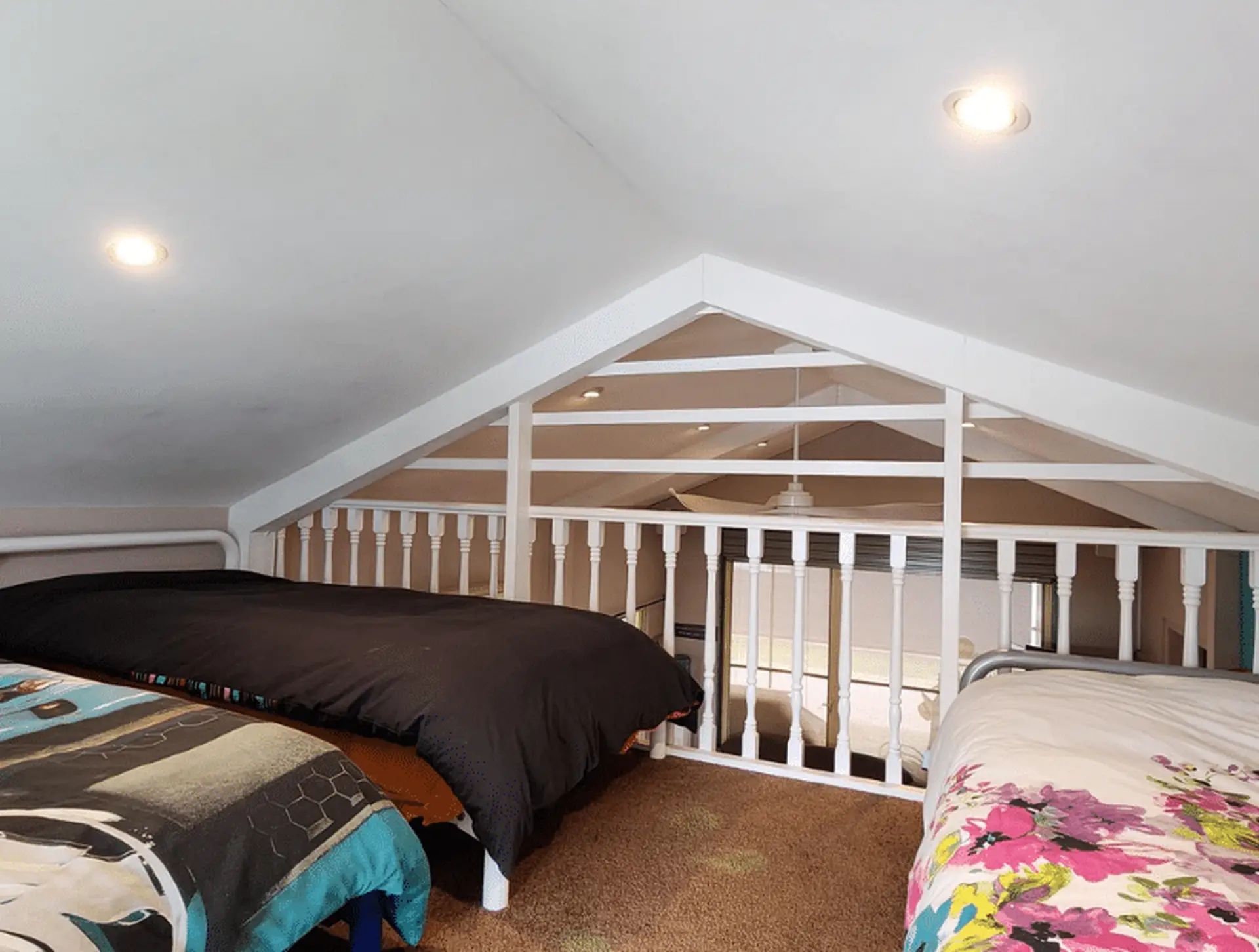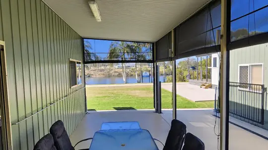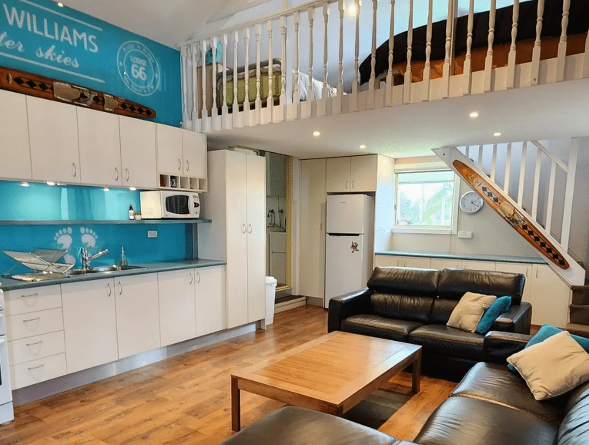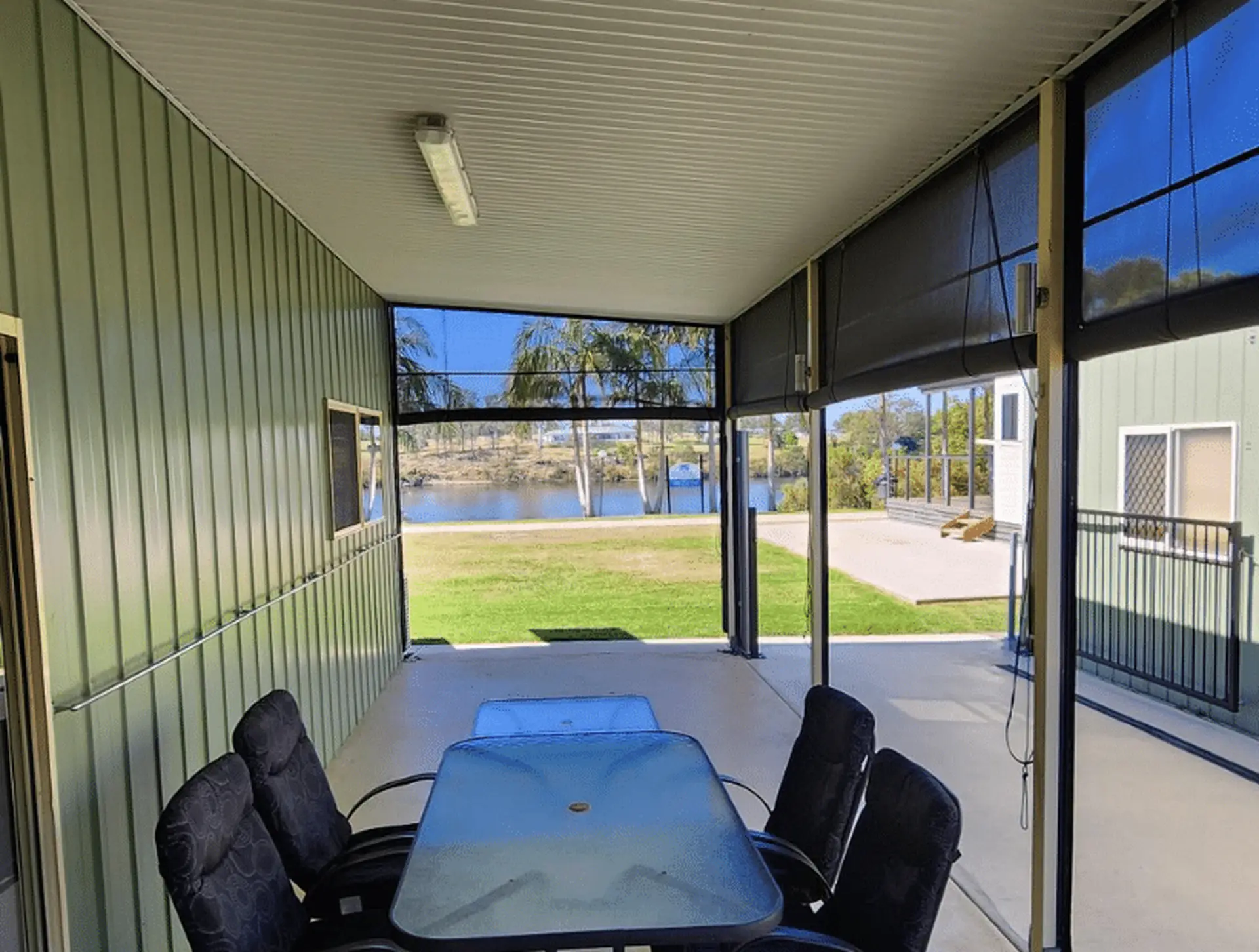 The open-plan living area includes a comfortable leather lounge with chaise, coffee table and eight-drawer buffet for storage. Sleeping is flexible, with a queen bed, double bed, and three single beds in a loft accessed via compliant stairs with safety battens. The loft’s louvre window and awning hoods capture cooling river breezes and views. The combined bathroom and laundry includes a shower, toilet, vanity, laundry sink, top-load washing machine, dryer and ceramic tapware.