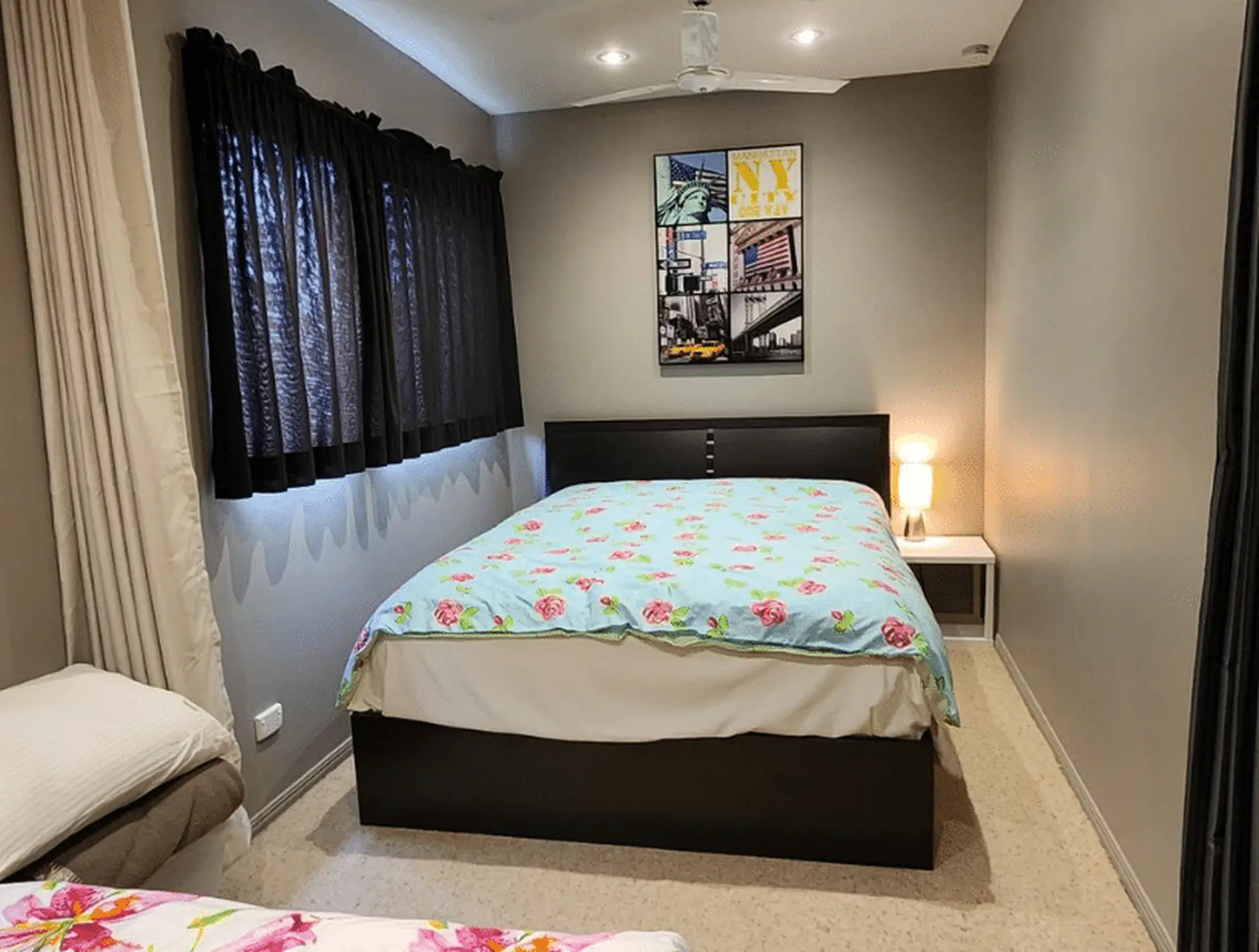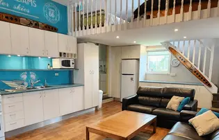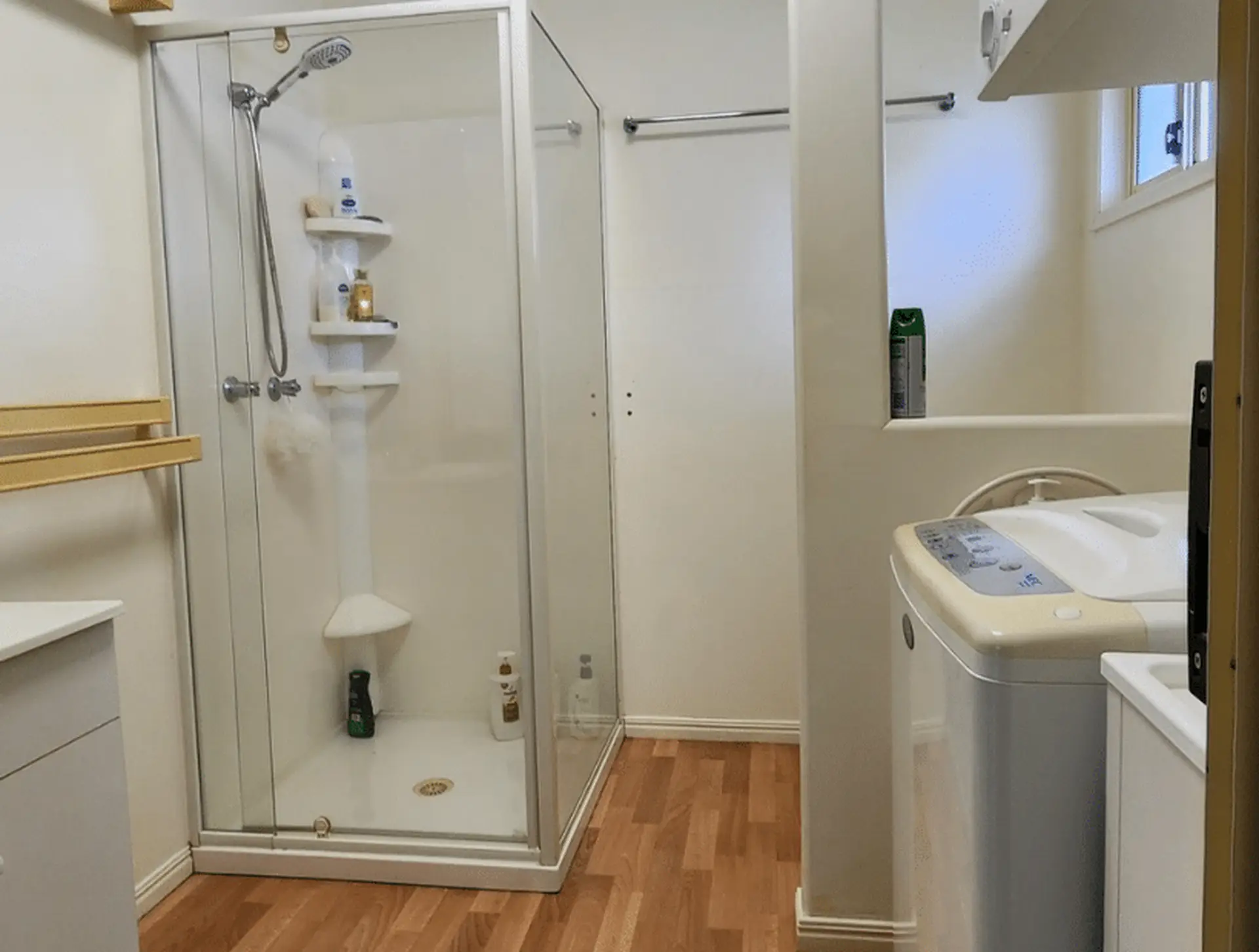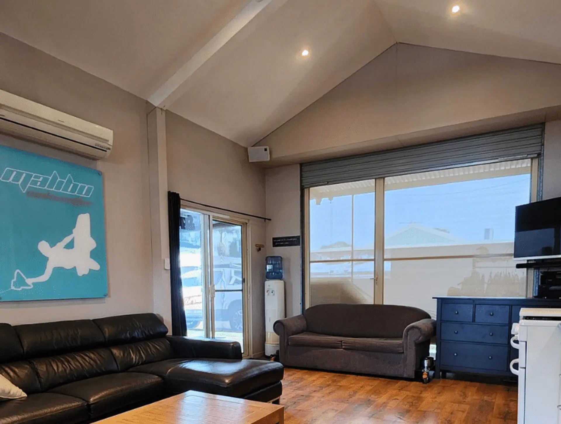 The open-plan living area includes a comfortable leather lounge with chaise, coffee table and eight-drawer buffet for storage. Sleeping is flexible, with a queen bed, double bed, and three single beds in a loft accessed via compliant stairs with safety battens. The loft’s louvre window and awning hoods capture cooling river breezes and views. The combined bathroom and laundry includes a shower, toilet, vanity, laundry sink, top-load washing machine, dryer and ceramic tapware.