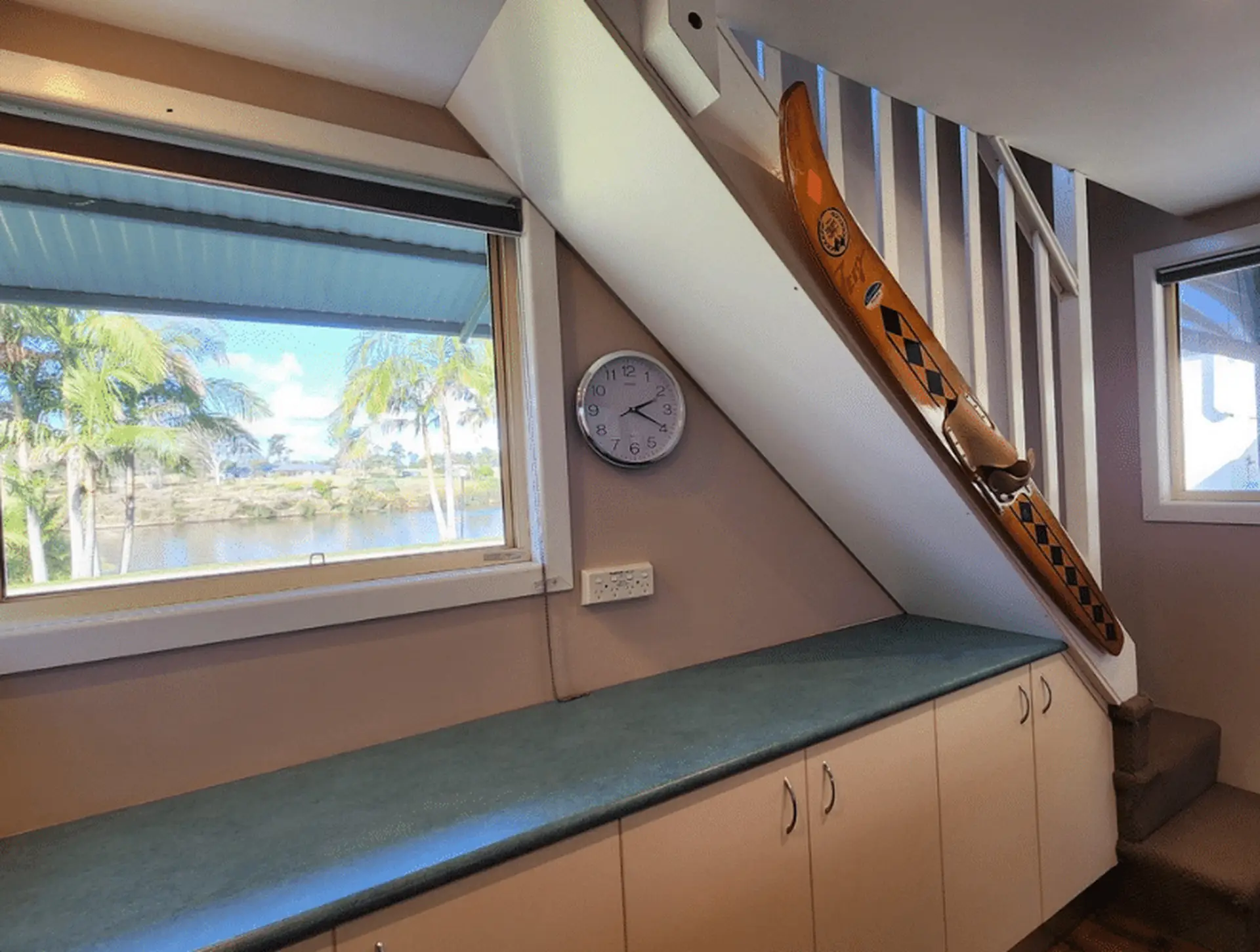 Outdoor living is a highlight, with two river-facing entertainment areas that are sealed and painted for low maintenance. Blinds are in excellent condition, with a retractable wind/privacy screen and front and rear 1200mm lockable gates. Boat storage is well catered for, offering drive-through boat access suitable for a 21’ Response boat, plus an internal blind for extra protection. The fully lined storage shed includes overhead shelving, ski and wakeboard racks, and a mobile wetsuit/vest rack. The insulated outdoor area with new lighting helps reduce heat on warmer days and protect stored equipment. Additional outdoor features include a hooded 4-burner gas BBQ and two outdoor tables with ten chairs.