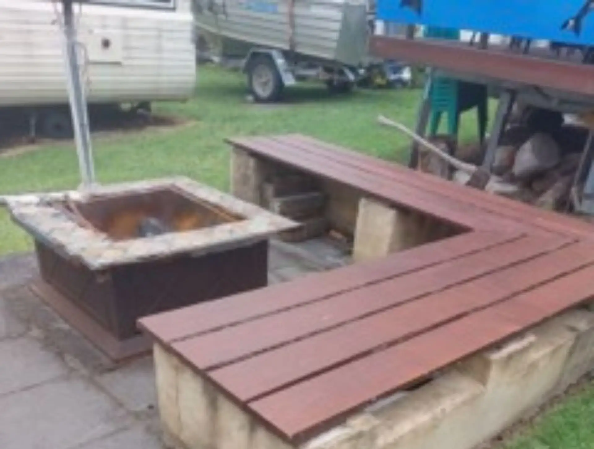 The outdoor area features a bench seat for enjoying the surroundings and a firepit that provides a cozy setting for outdoor gatherings and cooler evenings. There is also a storage box complete with tools and a waters tank and pump.