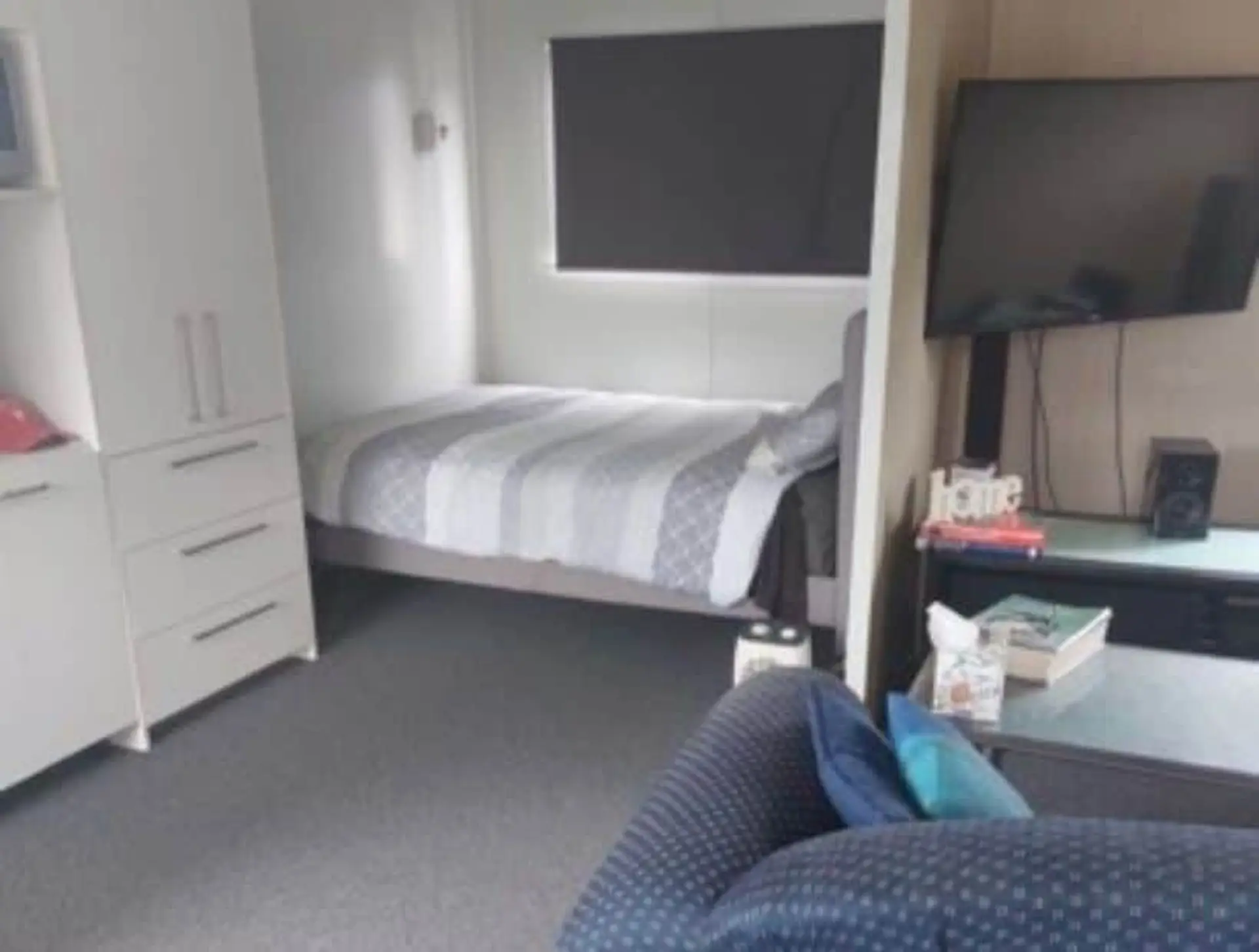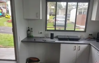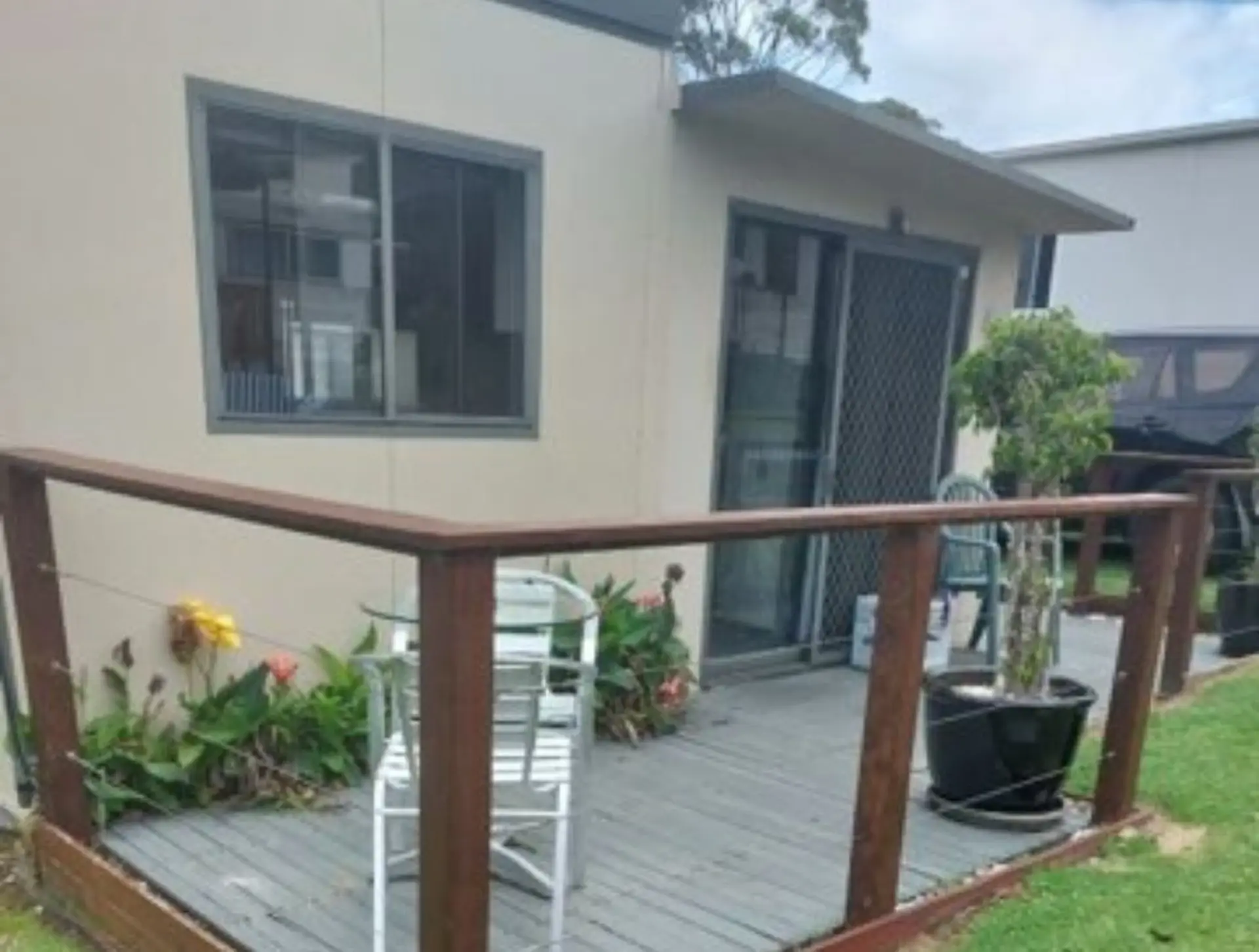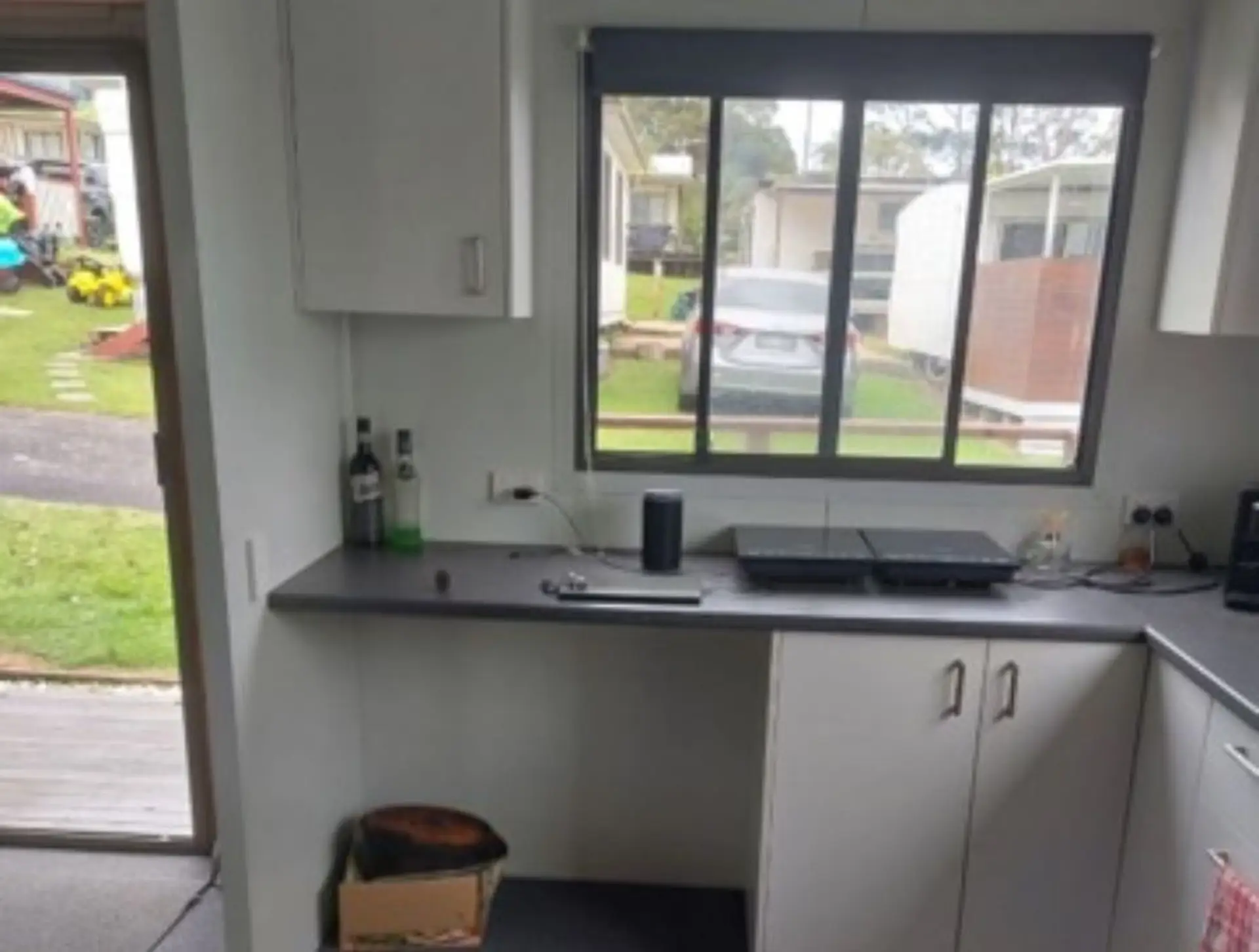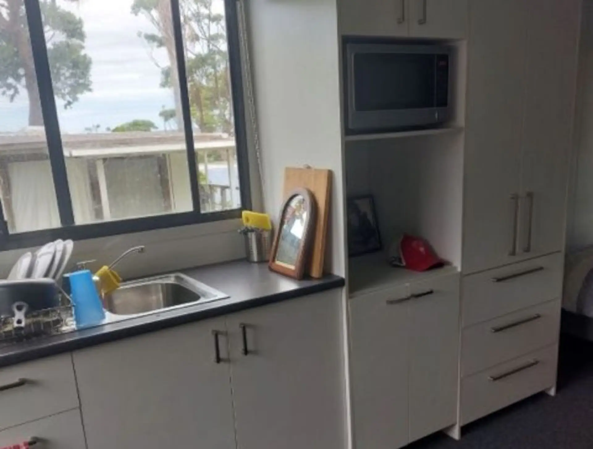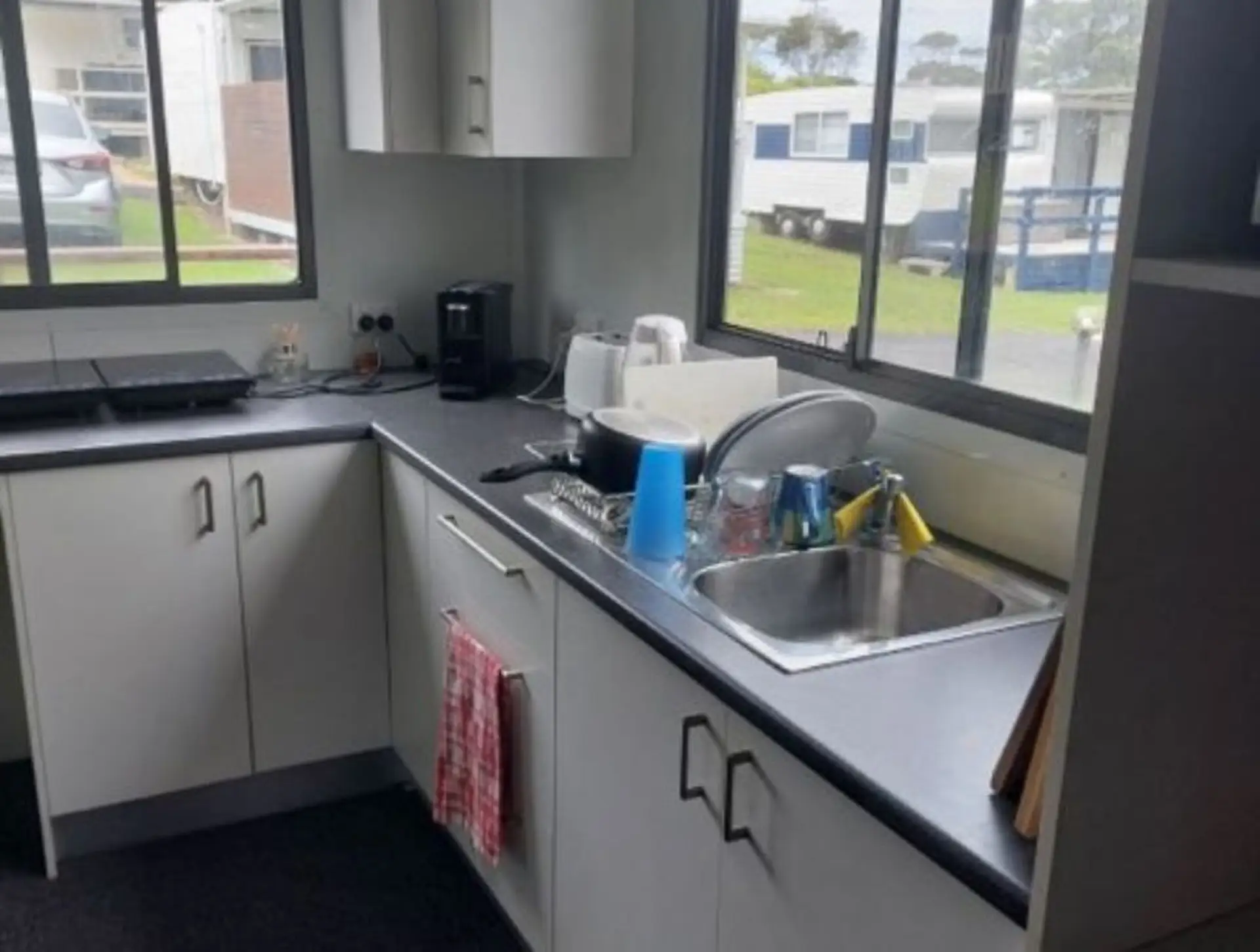 The kitchen is equipped with essential amenities, including crockery, cutlery and glasses. Cooking facilities consist of two bench top hotplates, a large refrigerator, a toaster and a kettle allowing for easy meal preparation.
