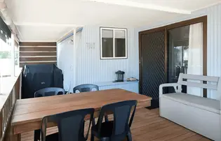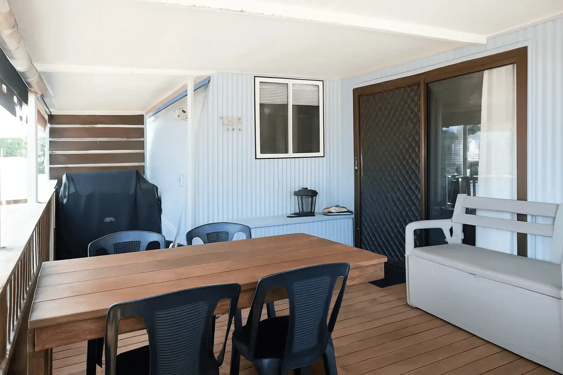 - Expansive covered deck with outdoor dining, BBQ, storage bench, and zippable café blinds